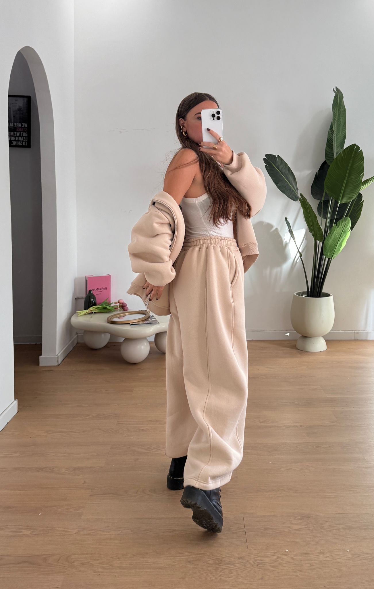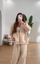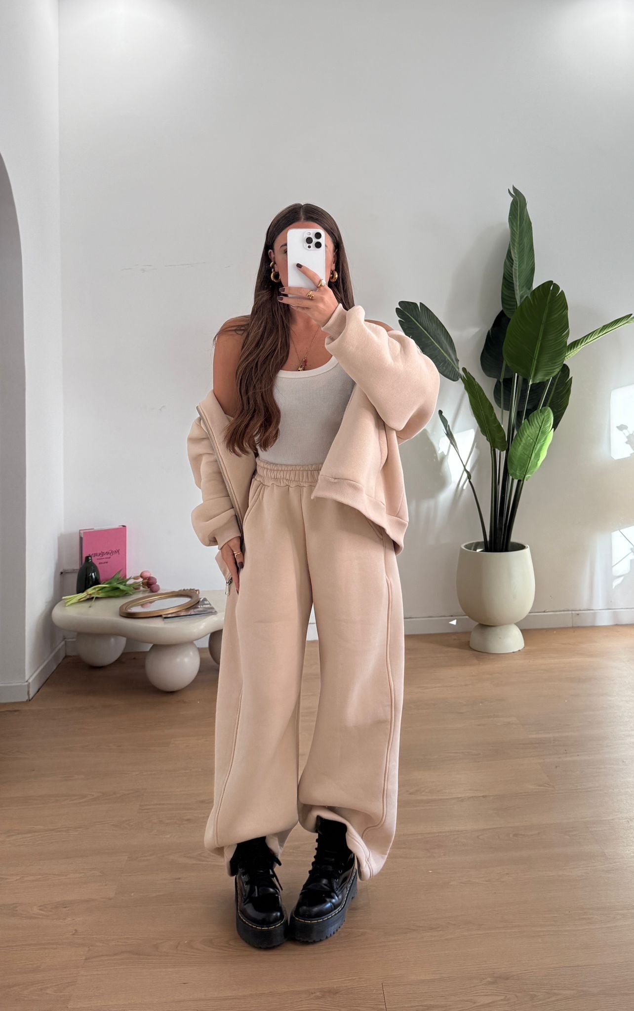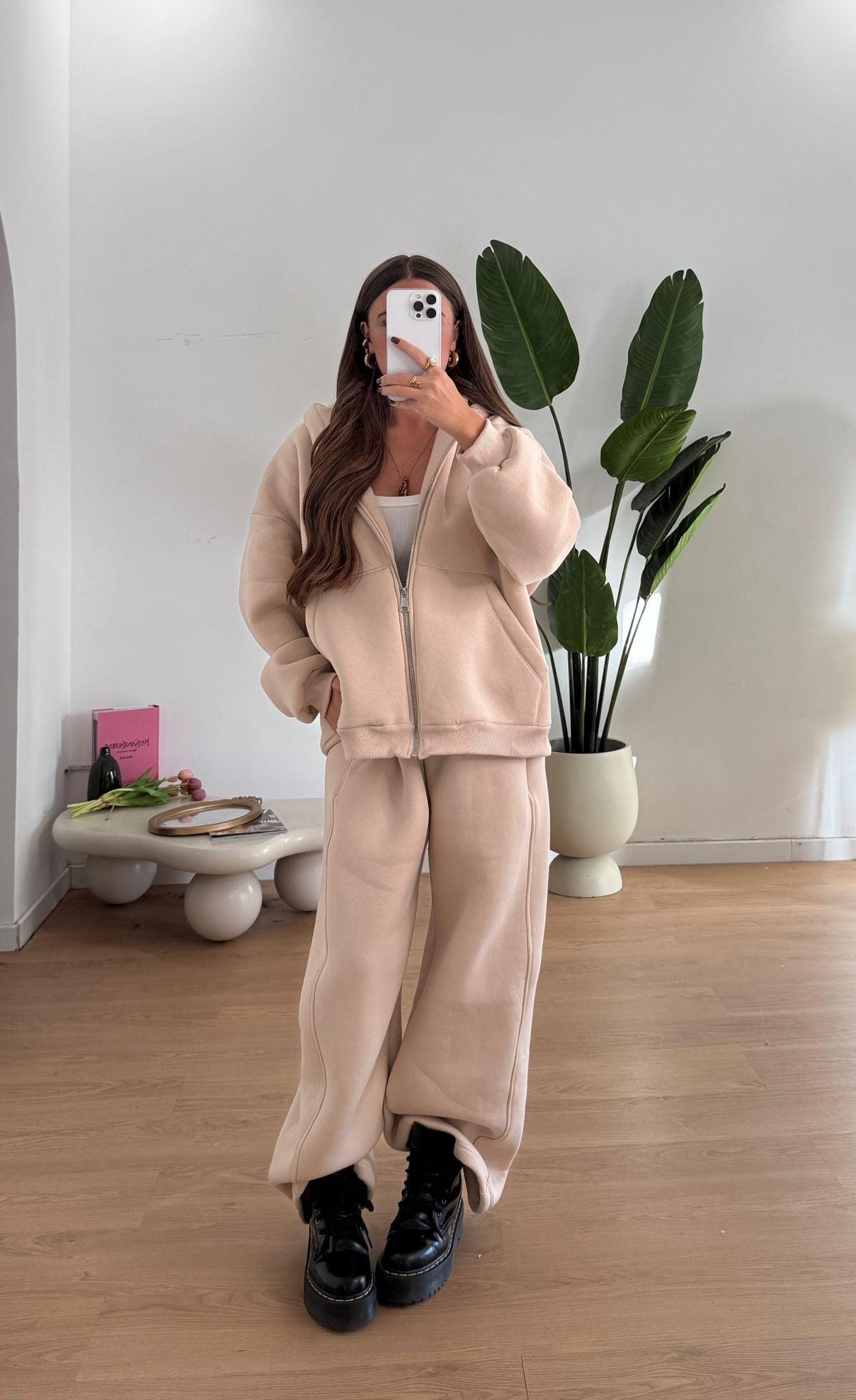 Coordinato da donna felpata internamente composto da felpa oversize con cappucci e chiusura zip sul davanti e pantalone con elastico in vita e vestirà bene fino a d una M/L