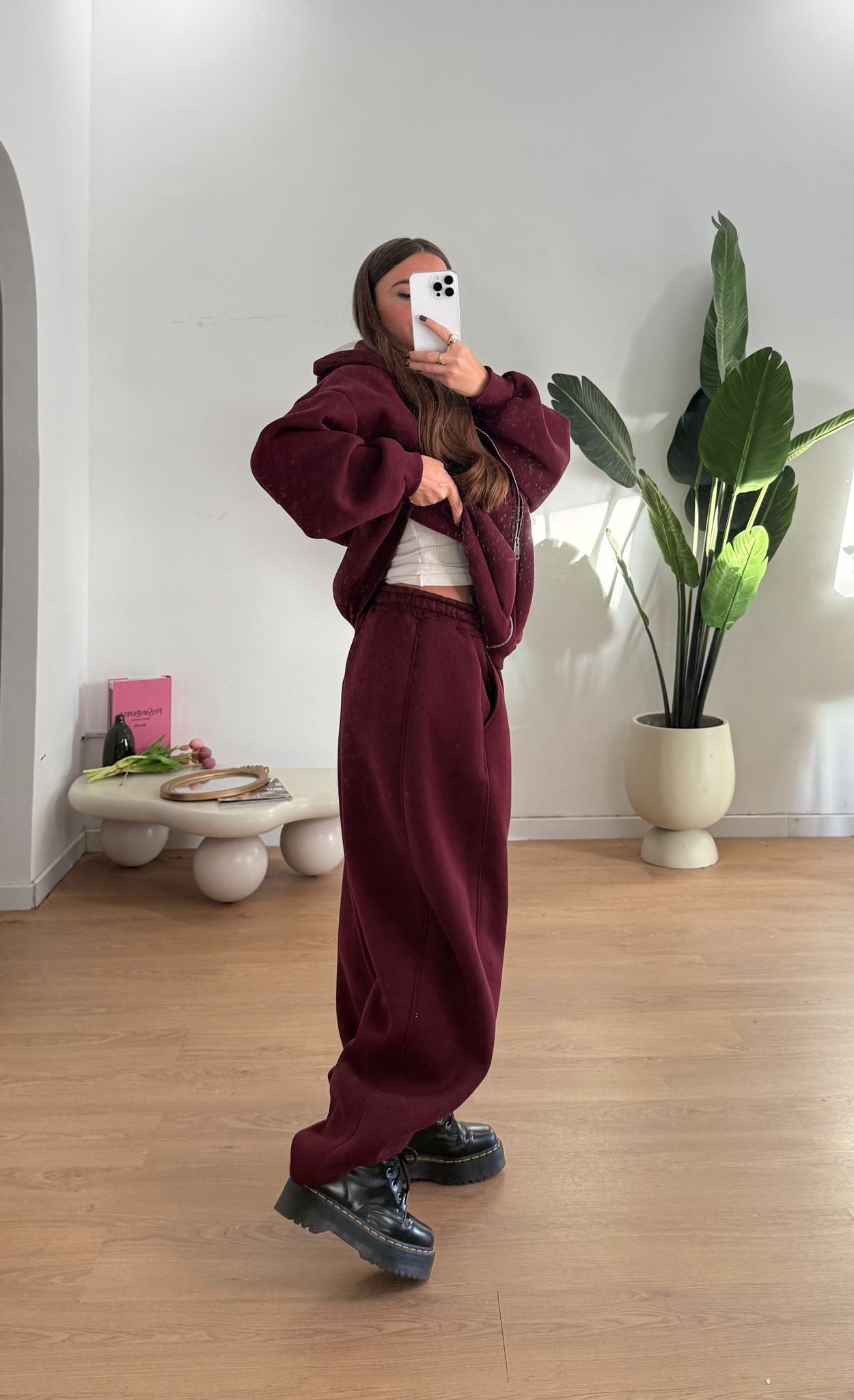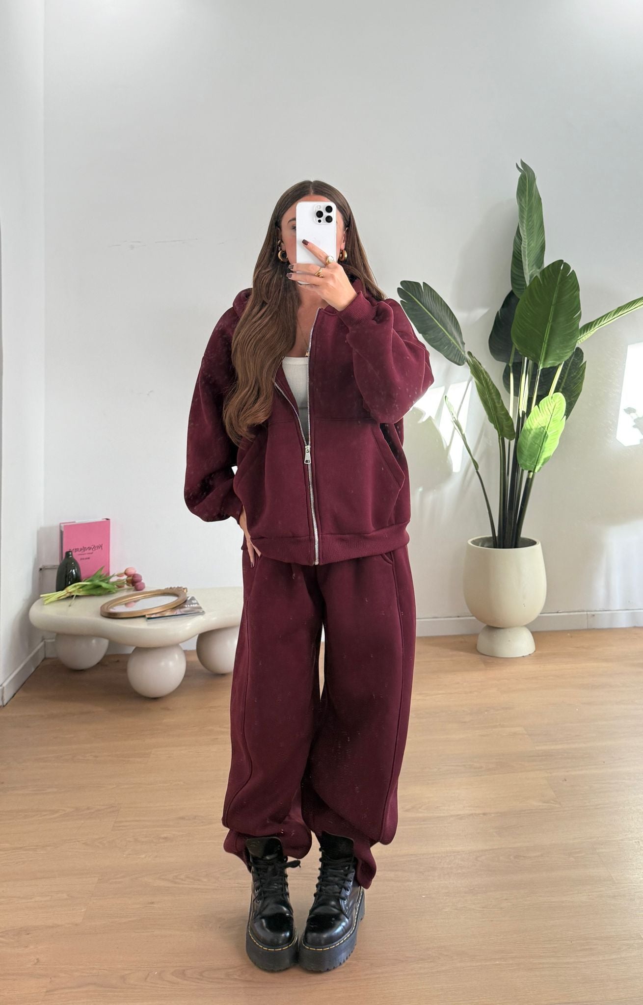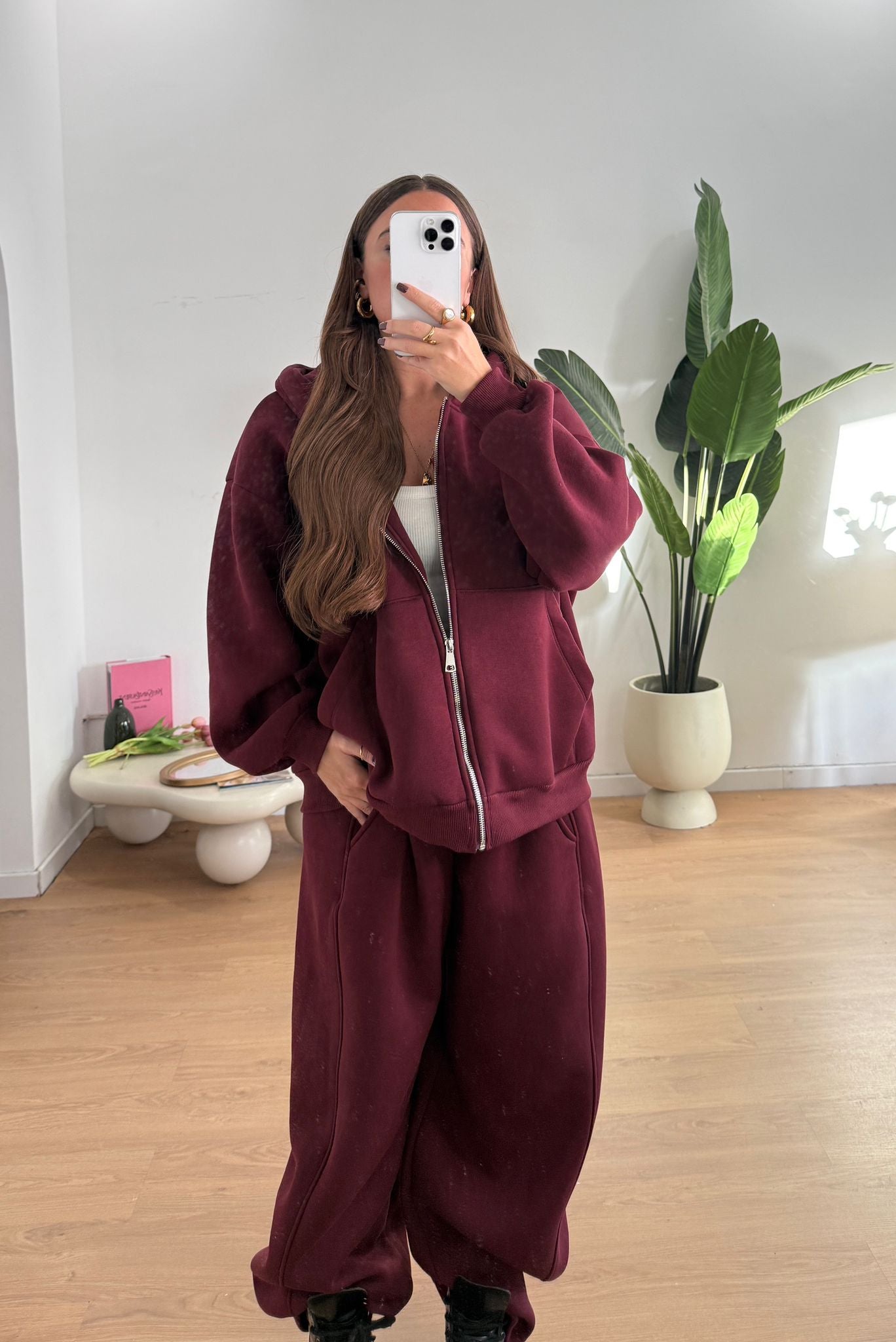 Coordinato da donna felpata internamente composto da felpa oversize con cappucci e chiusura zip sul davanti e pantalone con elastico in vita e vestirà bene fino a d una M/L