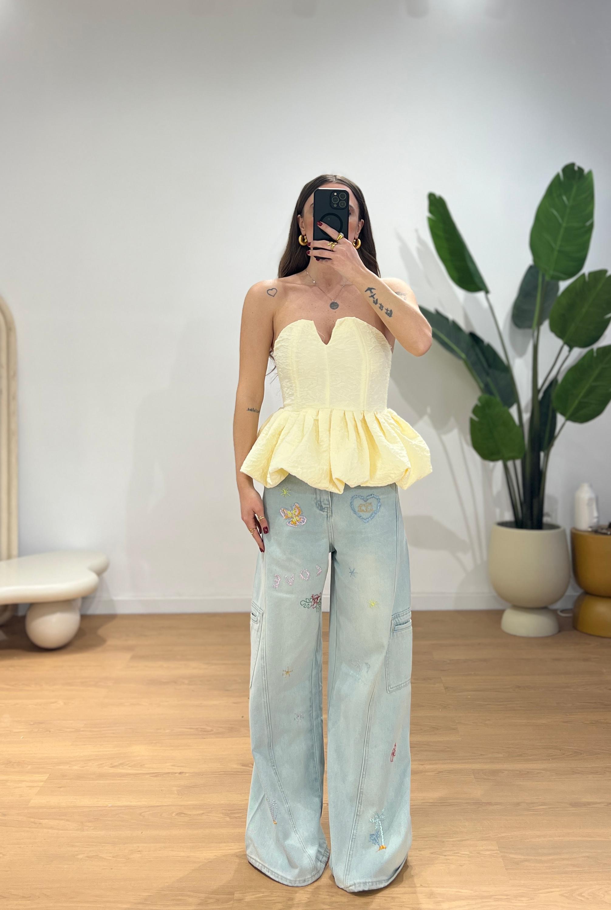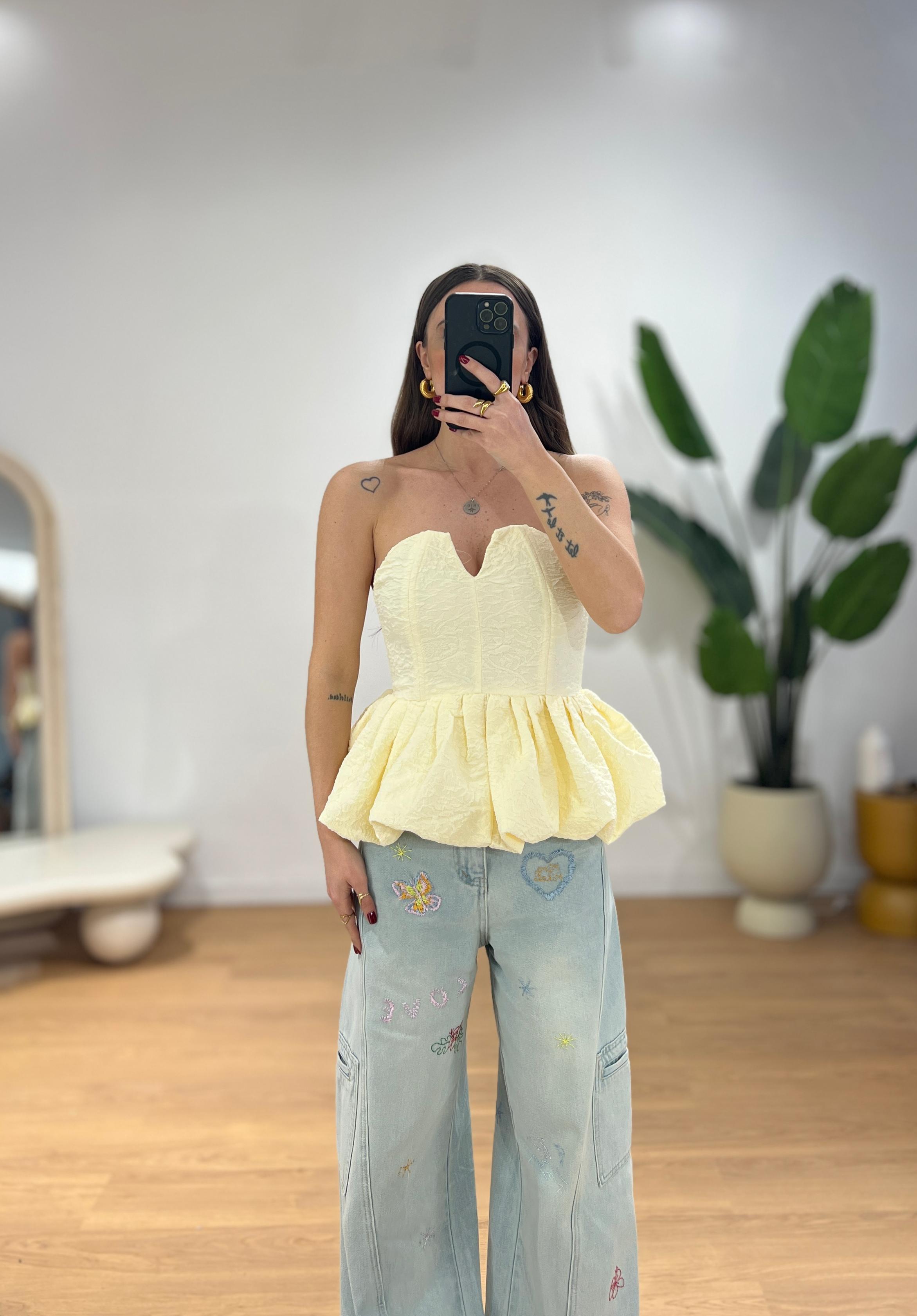 Corpetto a cuore senza spalline, con una scollatura strutturata e ferretti, termina sul fondo con un volant che aggiunge volume e movimento. Il tessuto dall'effetto stropicciato è leggermente elasticizzato. Sul retro presenta una chiusura con zip. Giusy indossa la taglia S.