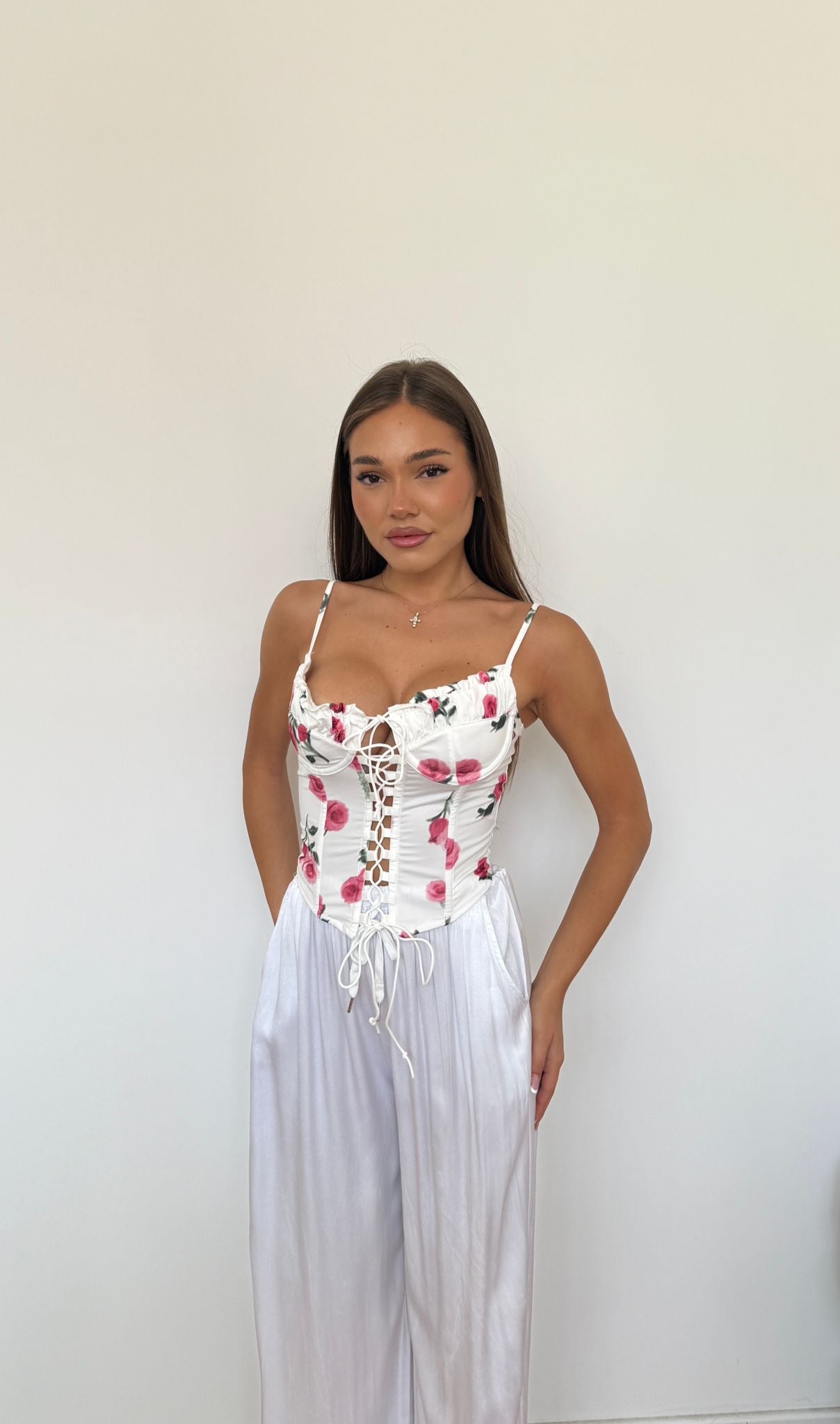 Corpetto da donna a fantasia fiori con coppa sfoderata e bretelle regolabili e veste regolarmente la propria taglia e la modella indossa taglia S