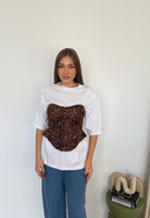 Corpetto da donna fantasia leopardato con coppa leggermente imbottita e attaccatura a reggiseno sul davanti, tessuto elasticizzato ma veste la propria taglia e la modella indossa taglia S/M