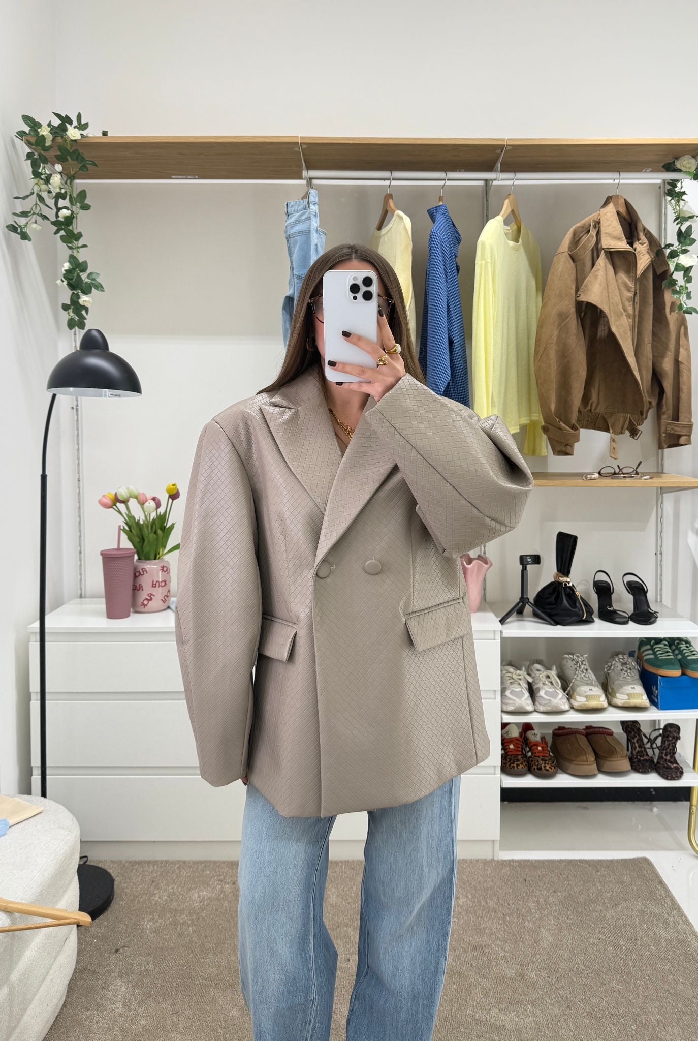Giacca in ecopelle lavorata modello oversize, foderata internamente e con chiusura bottone rivestito sul davanti e spalline imbottite. Vestirà bene fino ad una L/XL e la modella è alta 1,65 cm e pesa 52/53 kg
