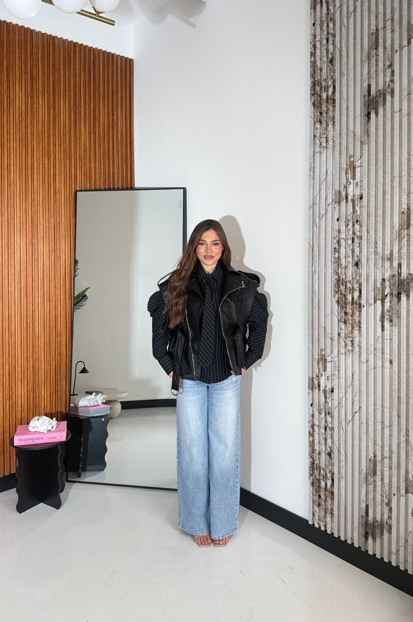 Gilet in ecopelle modello over con chiusura zip sul davanti, foderato internamente e con cintura compresa e vestita bene fino ad una M/L piena. La modella è alta 1,65 cm e pesa 52,53 kg