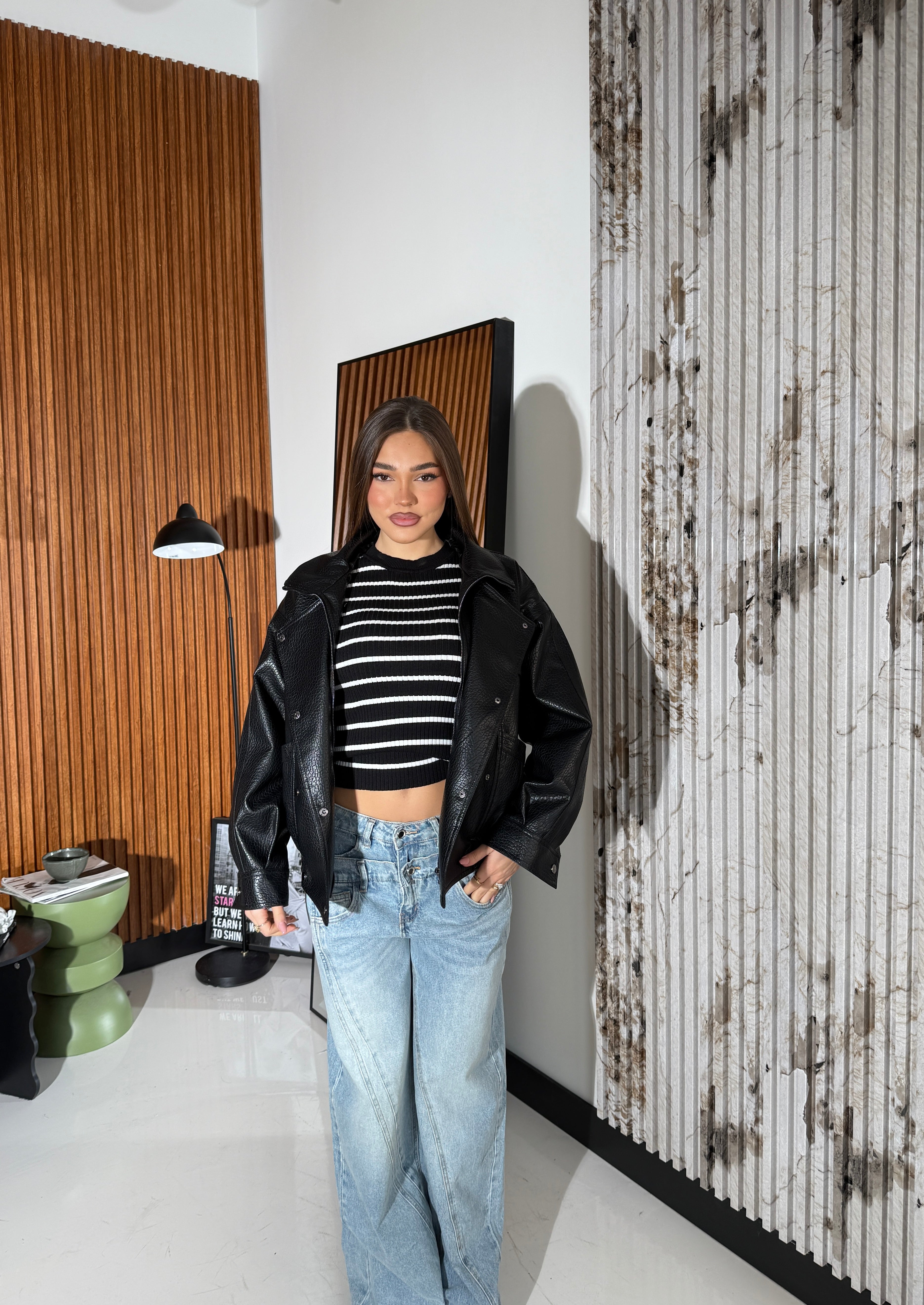 Giubbino da donna modello oversize in ecopelle foderato internamente con chiusura in zip e ciappe sul davanti, elastico in vita sul finale. Veste bene la propria taglia e la modella indossa taglia S/M ed è alta 1,65 e pesa 52/53 kg.