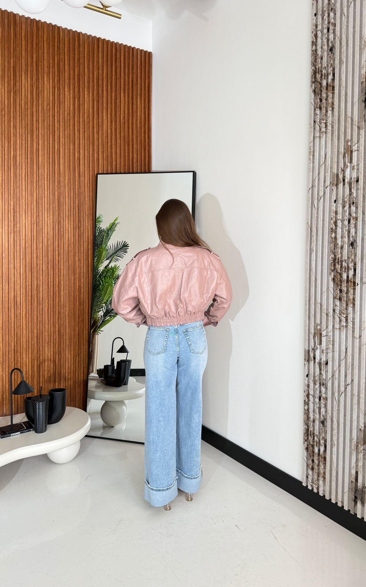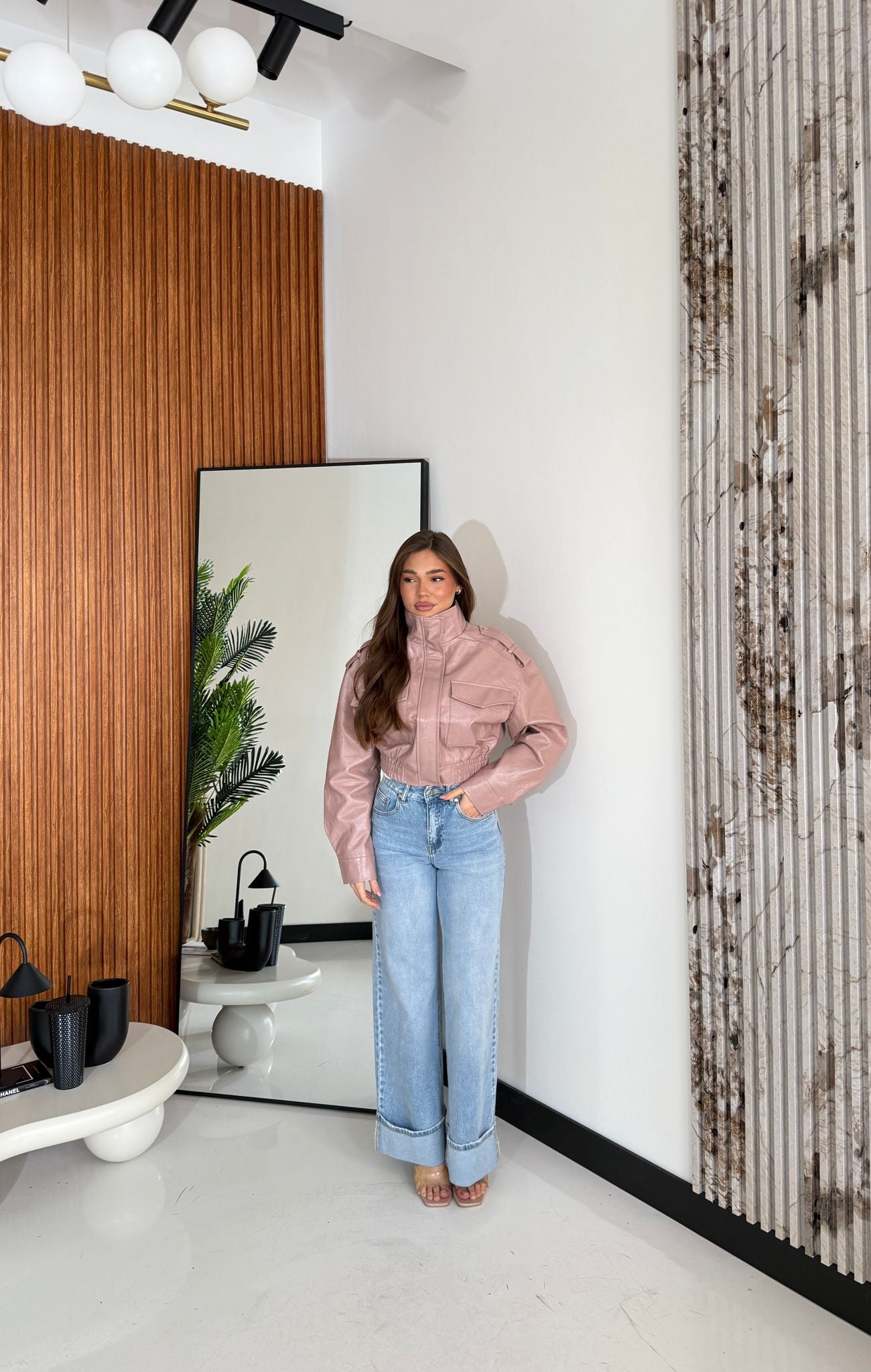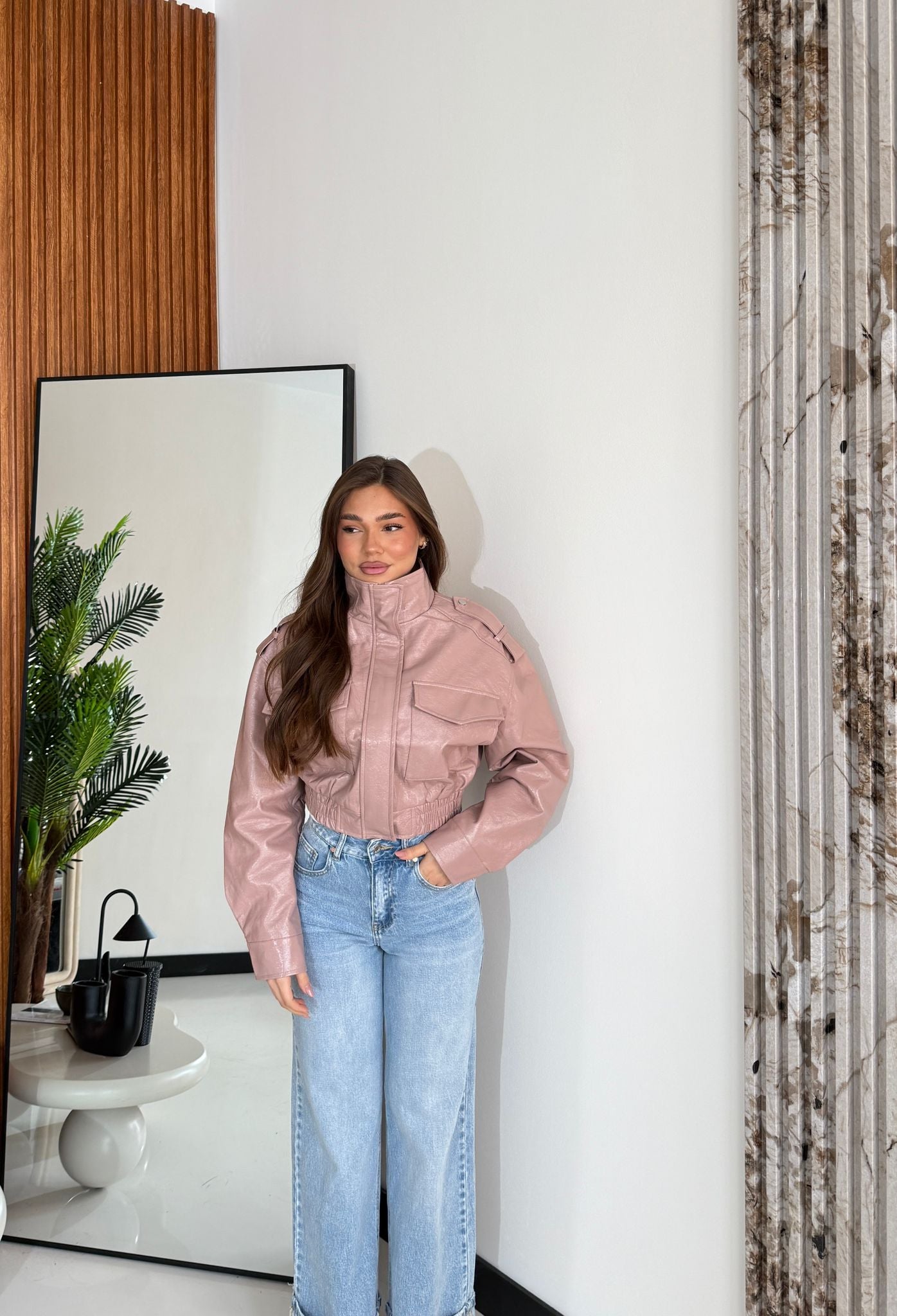 Giubbino in ecopelle foderato internamente con elastico sul finale sul retro, chiusura zip sul davanti e veste bene la propria taglia e la modella indossa taglia S ed è alta 1,65 cm e pesa 52/63 kg