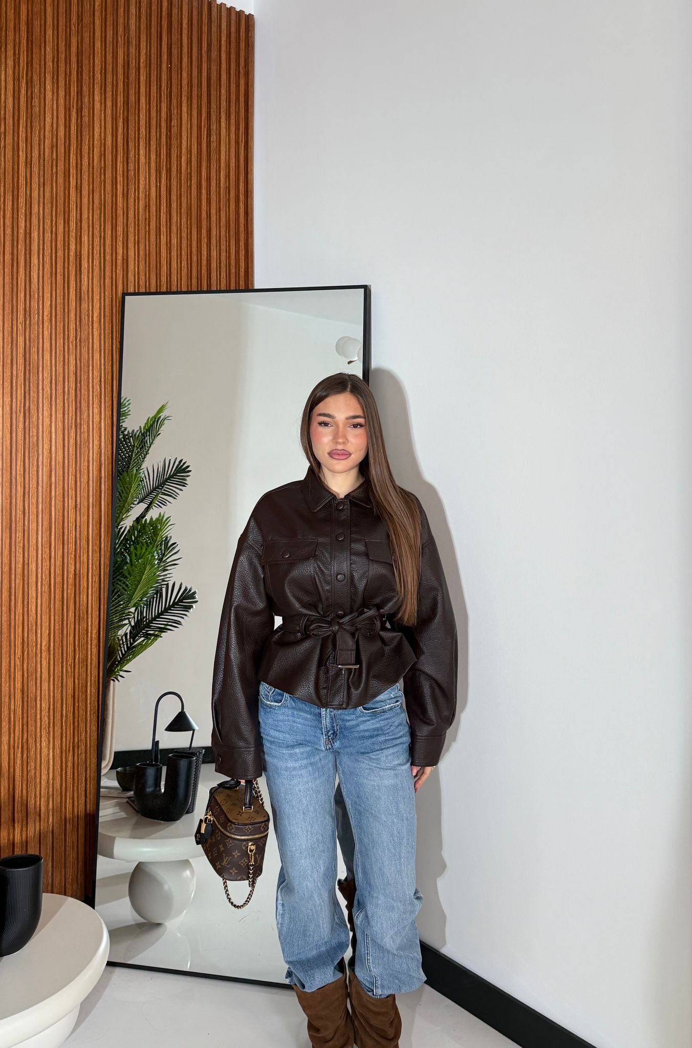 Giubbino in ecopelle foderato internamente top quality, vestibilità oversize e chiusura zip sul davanti. Vestirà bene fino ad una L/XL e la modella è alta 1,65 cm e pesa 52/53 kg