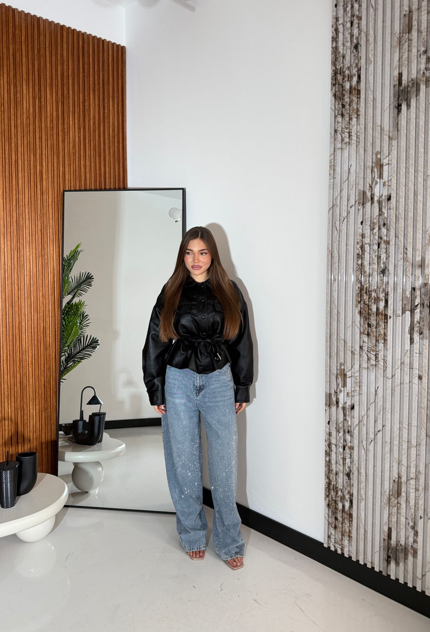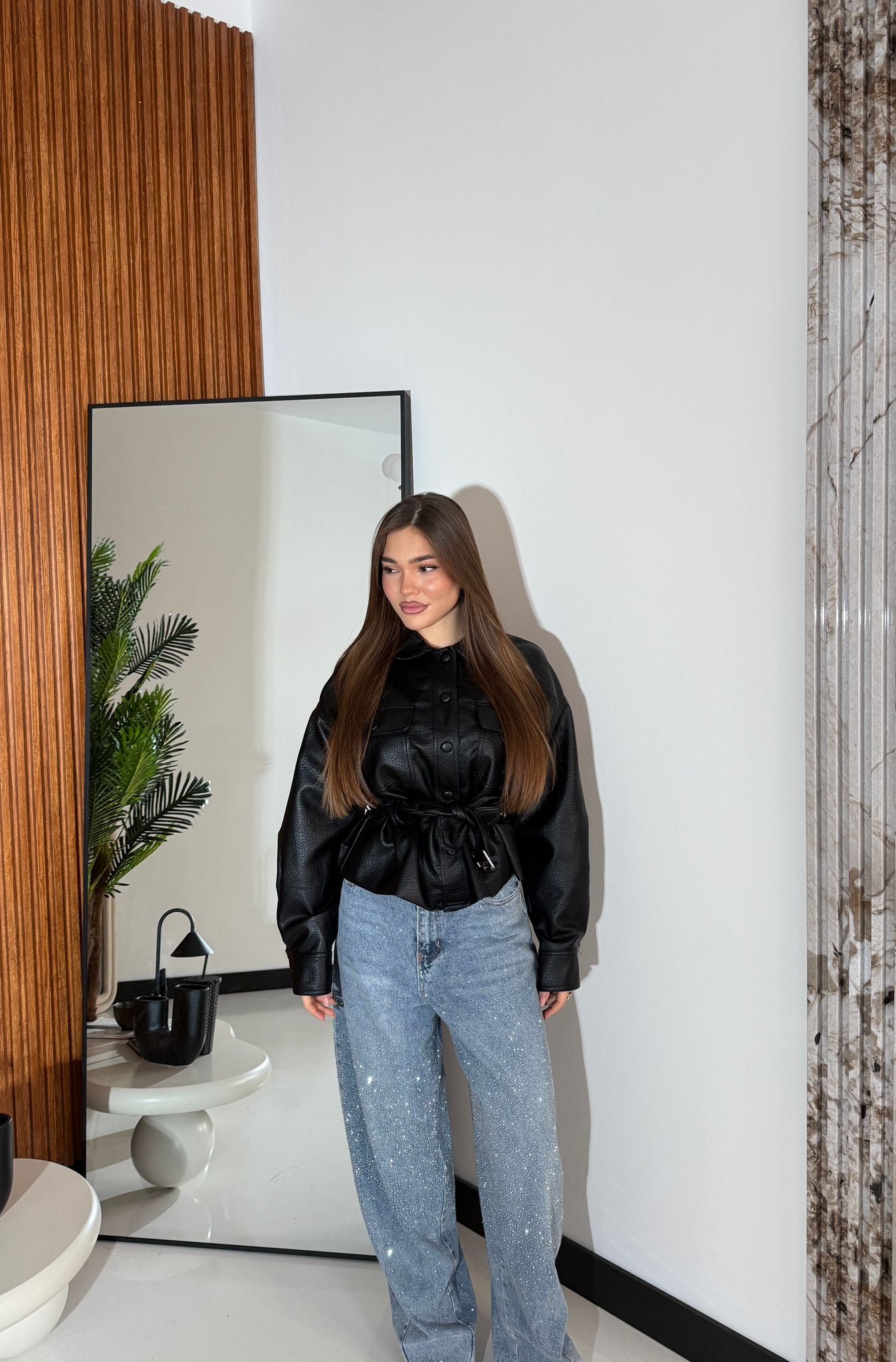 Giubbino in ecopelle foderato internamente top quality, vestibilità oversize e chiusura zip sul davanti. Vestirà bene fino ad una L/XL e la modella è alta 1,65 cm e pesa 52/53 kg