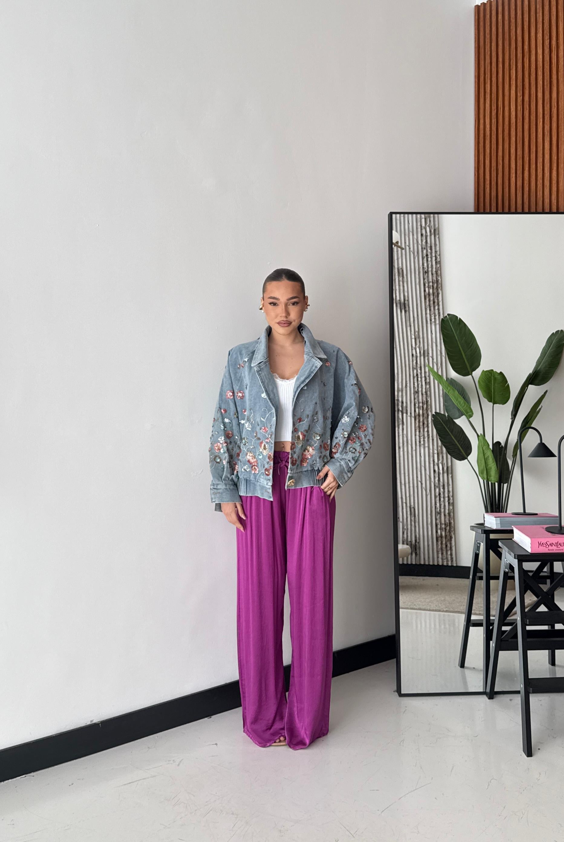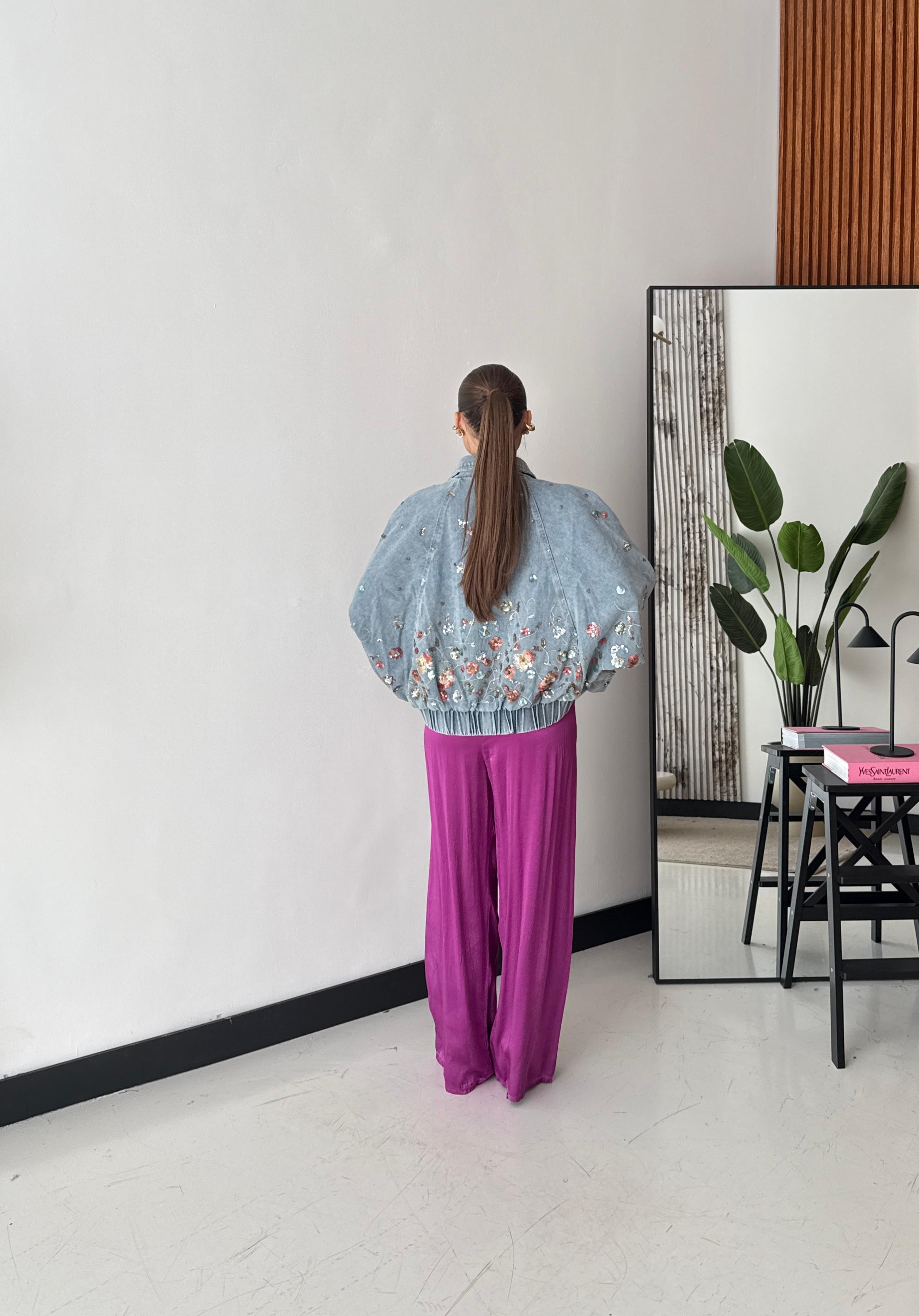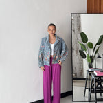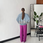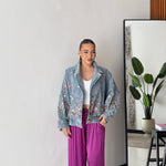 Giubbino in tela fissa, modello oversize, effetto elasticizzato in vita con chiusura sul davanti, manica ampia e tasche laterali. Veste bene fino ad una taglia M/L. La modella è alta 1,65 e pesa 52/53kg