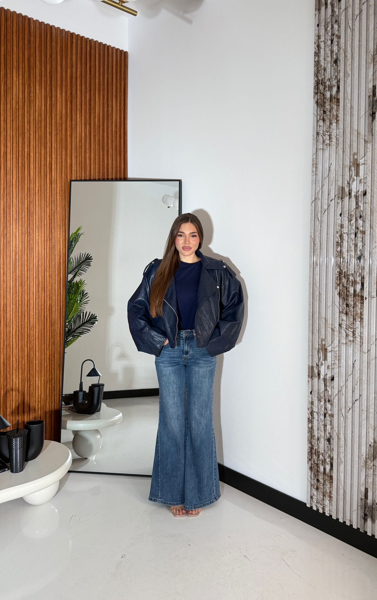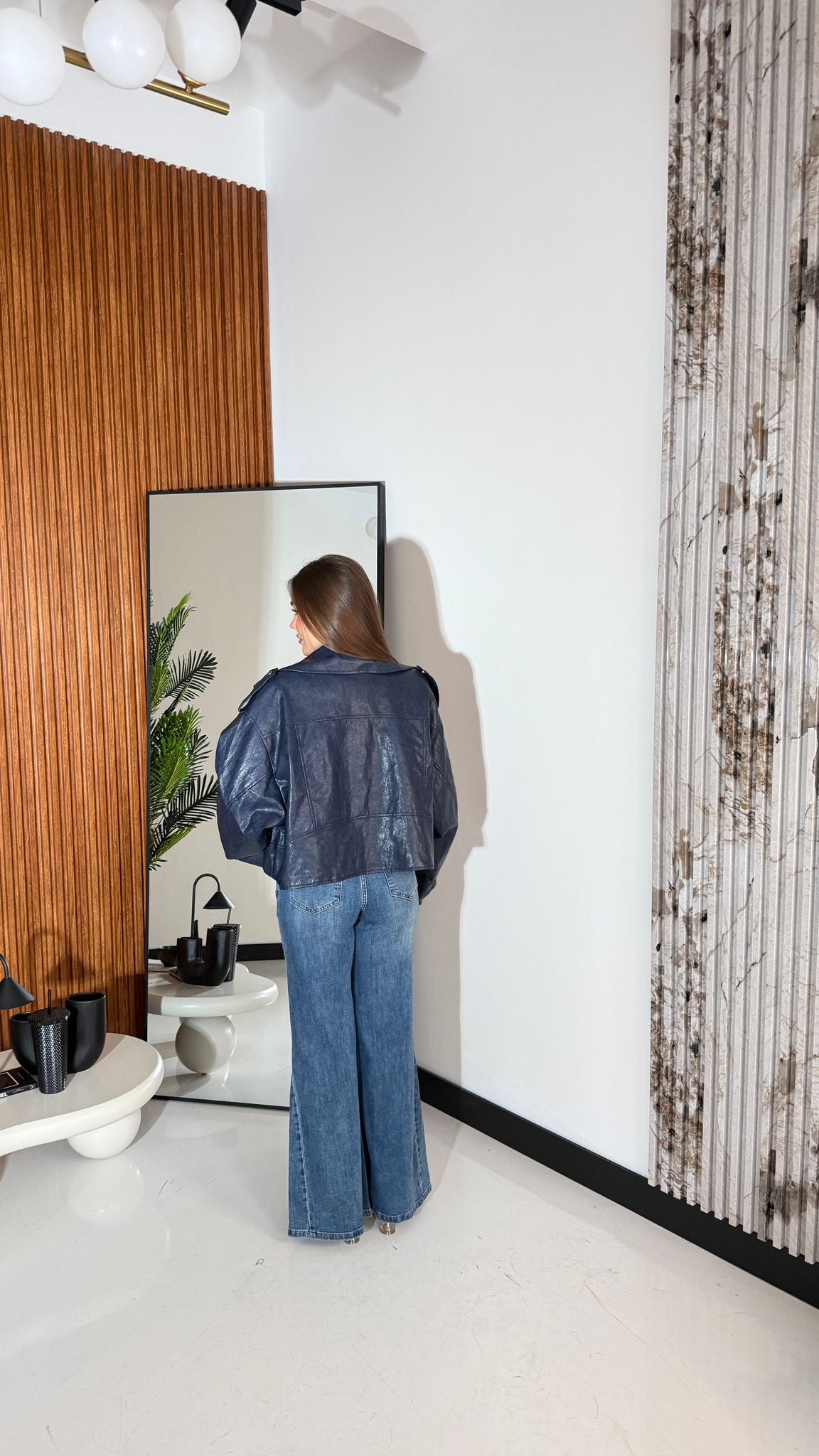 Giubbino in ecopelle foderato internamente, chiusura in zip ed è un top quality e vestirà bene fino ad una M/L piena e la modella è alta 1,65 cm e pesa 52/53 kg