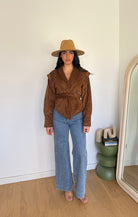 Giubbino da donna in camoscio con cintura compresa e veste regolarmente la propria taglia e la modella indossa taglia S/M
