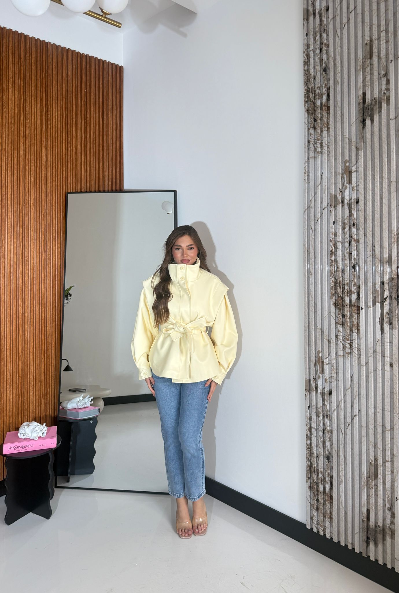 Giubbino in ecopelle foderato internamente, manica over, cintura compresa e chiusura bottone sul davanti. Veste bene la propria taglia e la modella indossa taglia S/M ed è alta 1,65 cm e pesa 52/53 kg