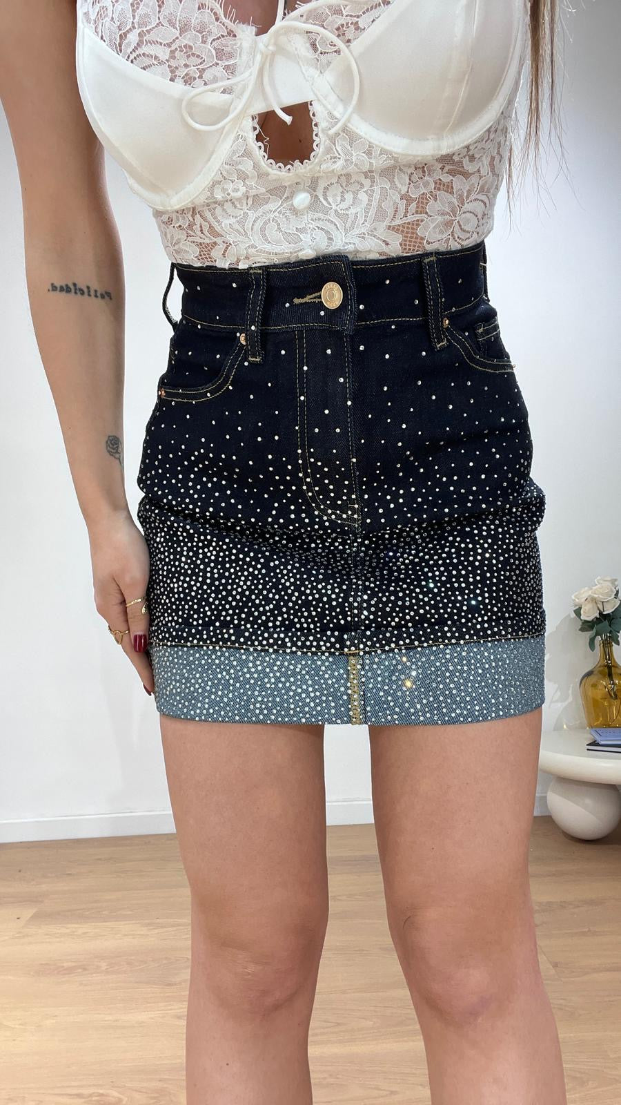 Gonna da donna in denim scuro ricoperta di strass, tessuto elasticizzato con piegone cucito sul finale ma veste regolarmente la propria taglia e Giusy indossa taglia XS