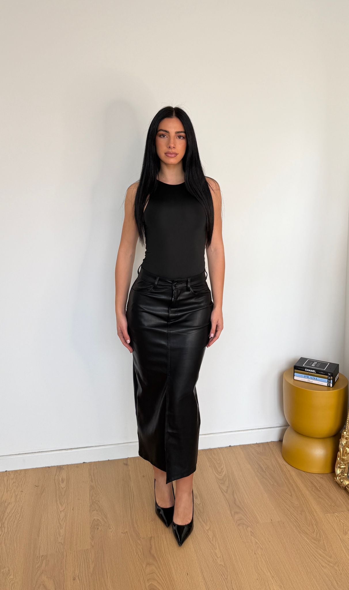 Gonna da donna in ecopelle, tessuto elasticizzato e con spacchetto sul davanti e veste bene la propria taglia e la modella indossa taglia S