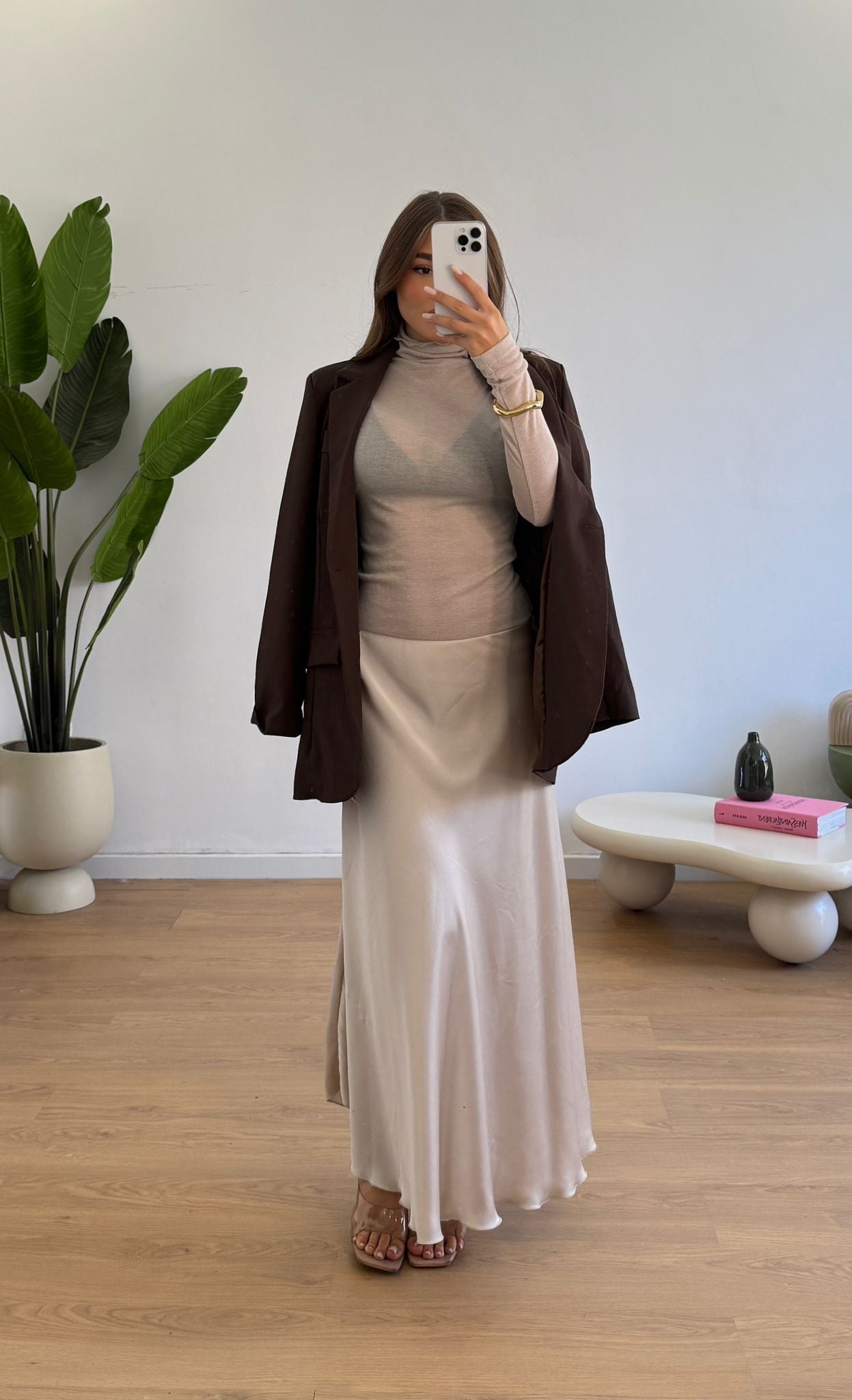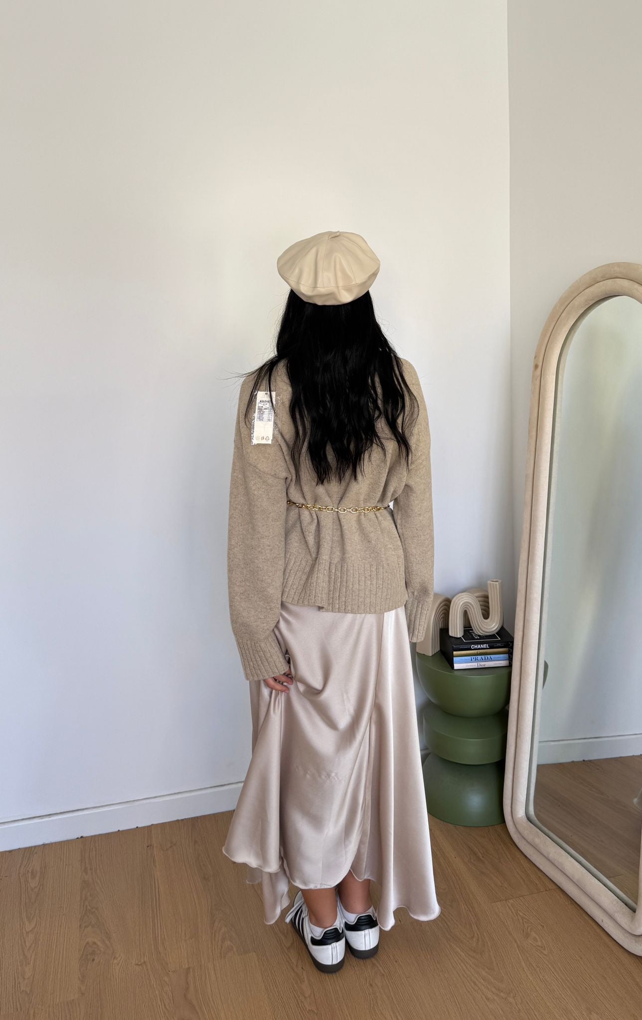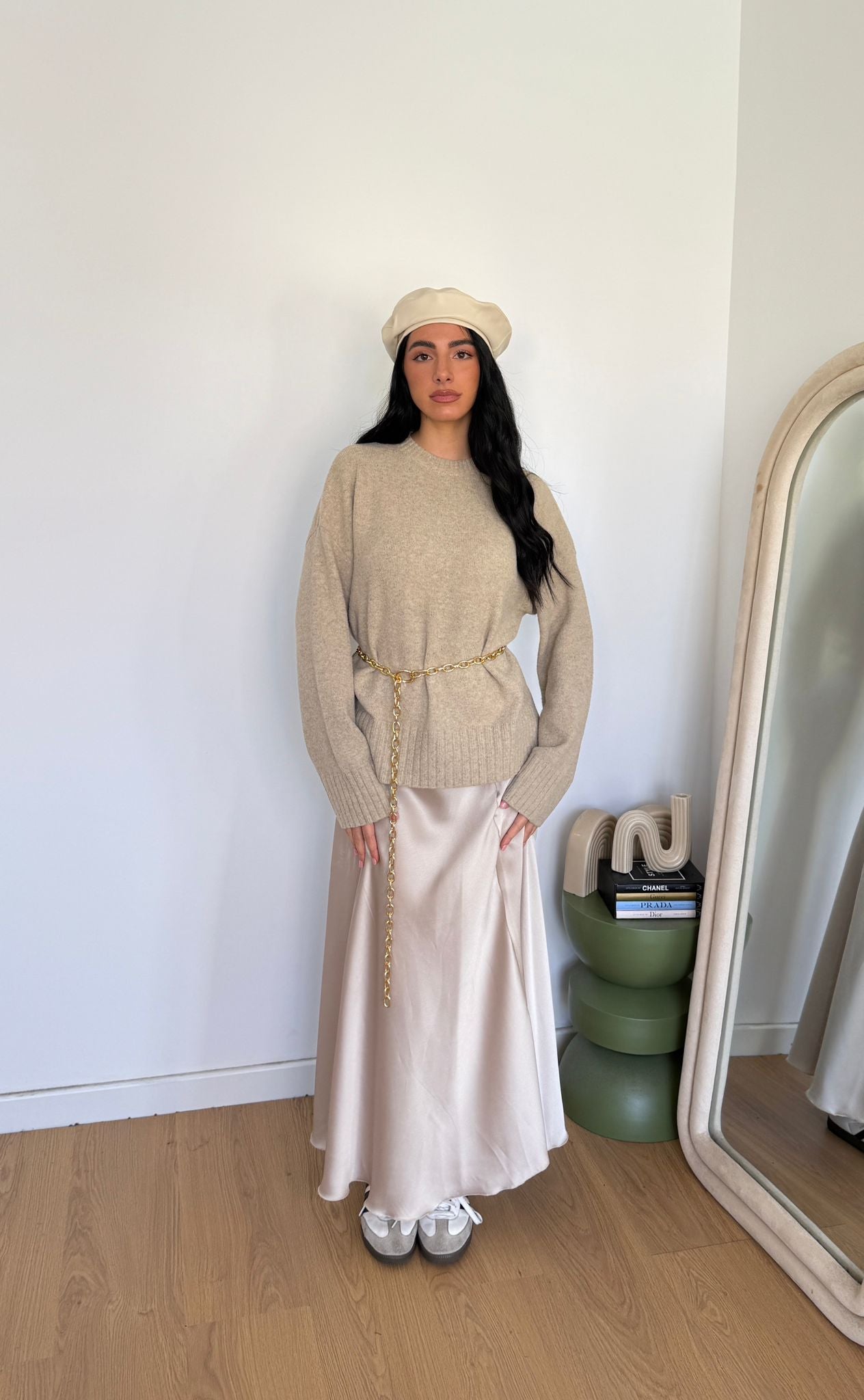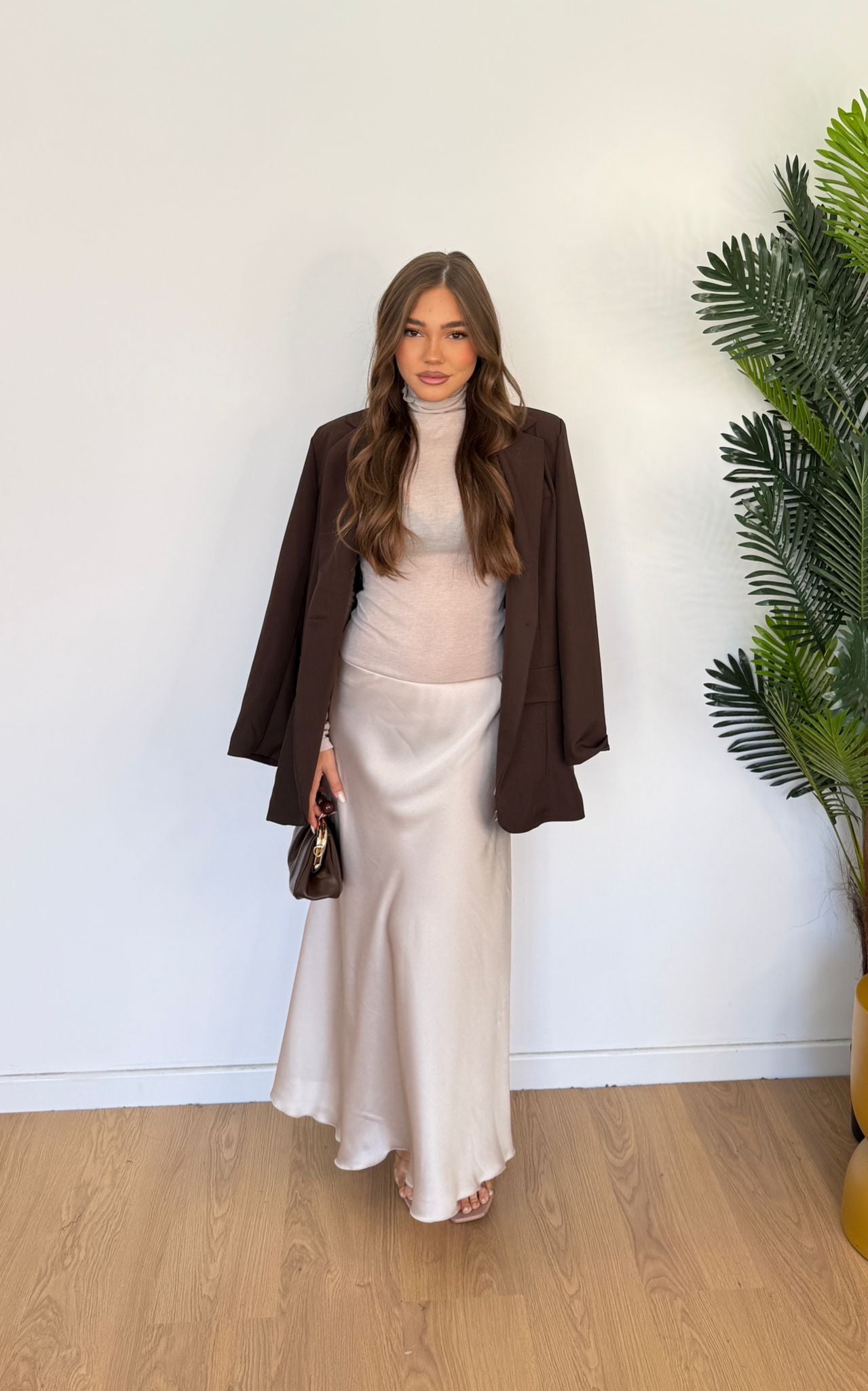 Gonna in simil raso, modello a campana e lunghezza longuette con elastico in vita. Veste fino ad una taglia M piena.