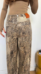 Jeans da donna in tela fissa non elasticizzato, fantasia leopardato e veste la propria taglia e la modella indossa taglia S
