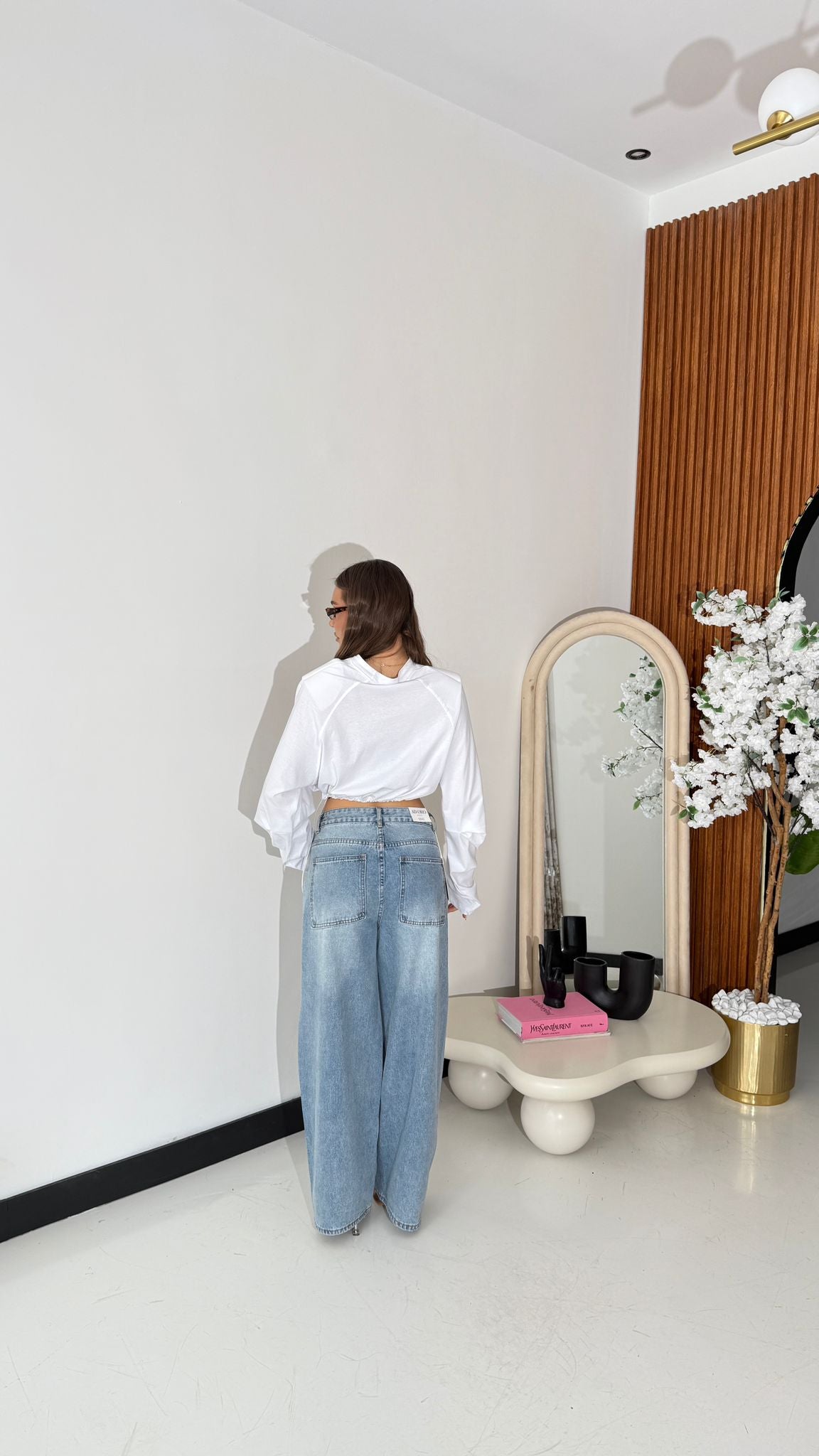 Jeans in denim chiaro in tela fissa non elasticizzato, modello ballon e veste la propria taglia ma la modella per ottenere un effetto più morbido indossa taglia M ed è alta 1,65 cm e pesa 52/53 kg