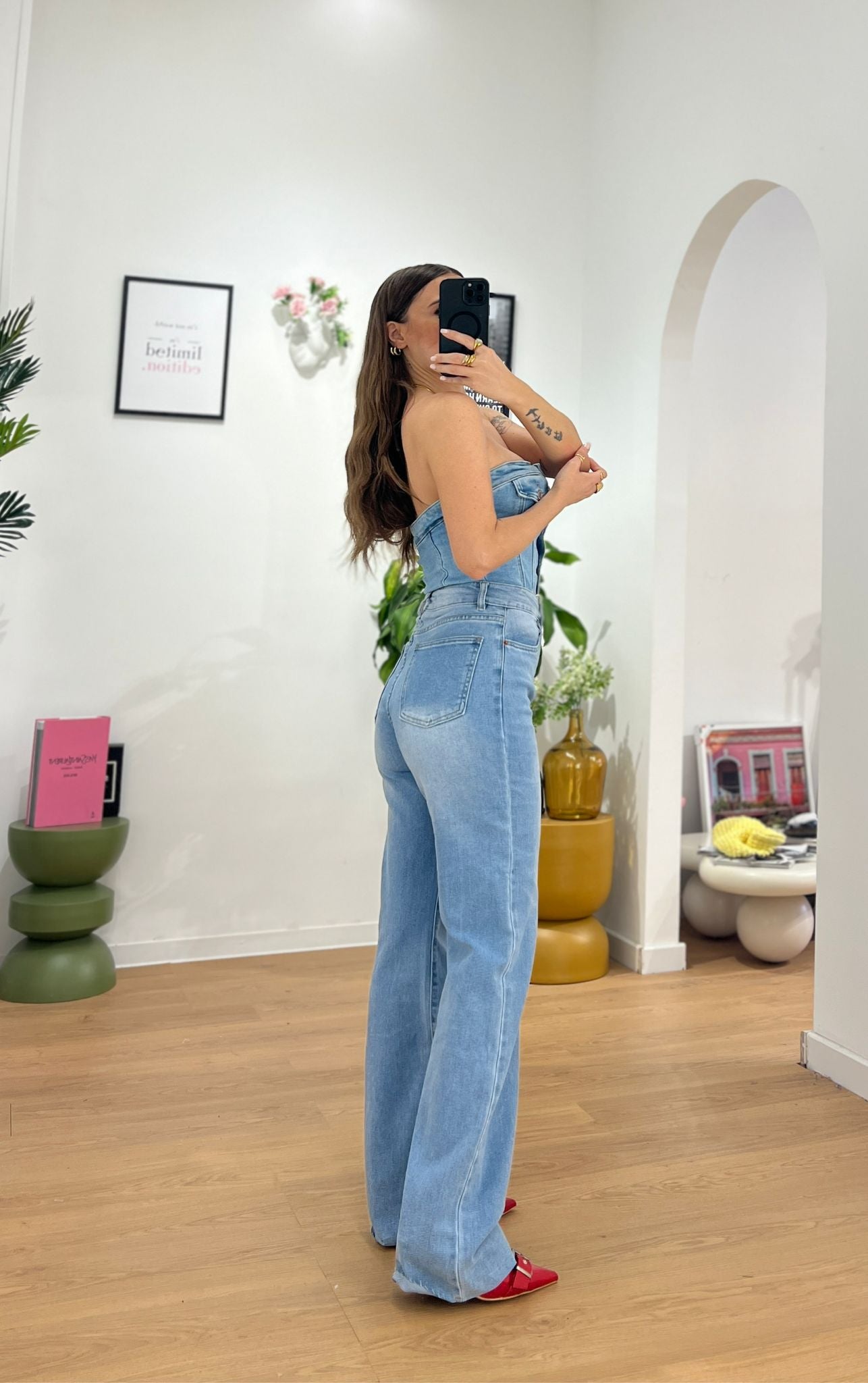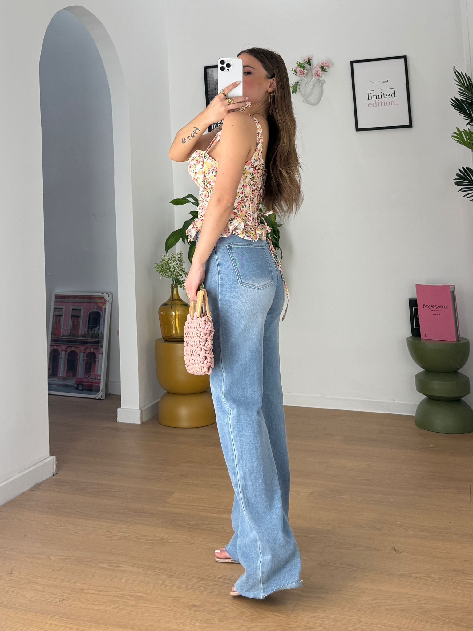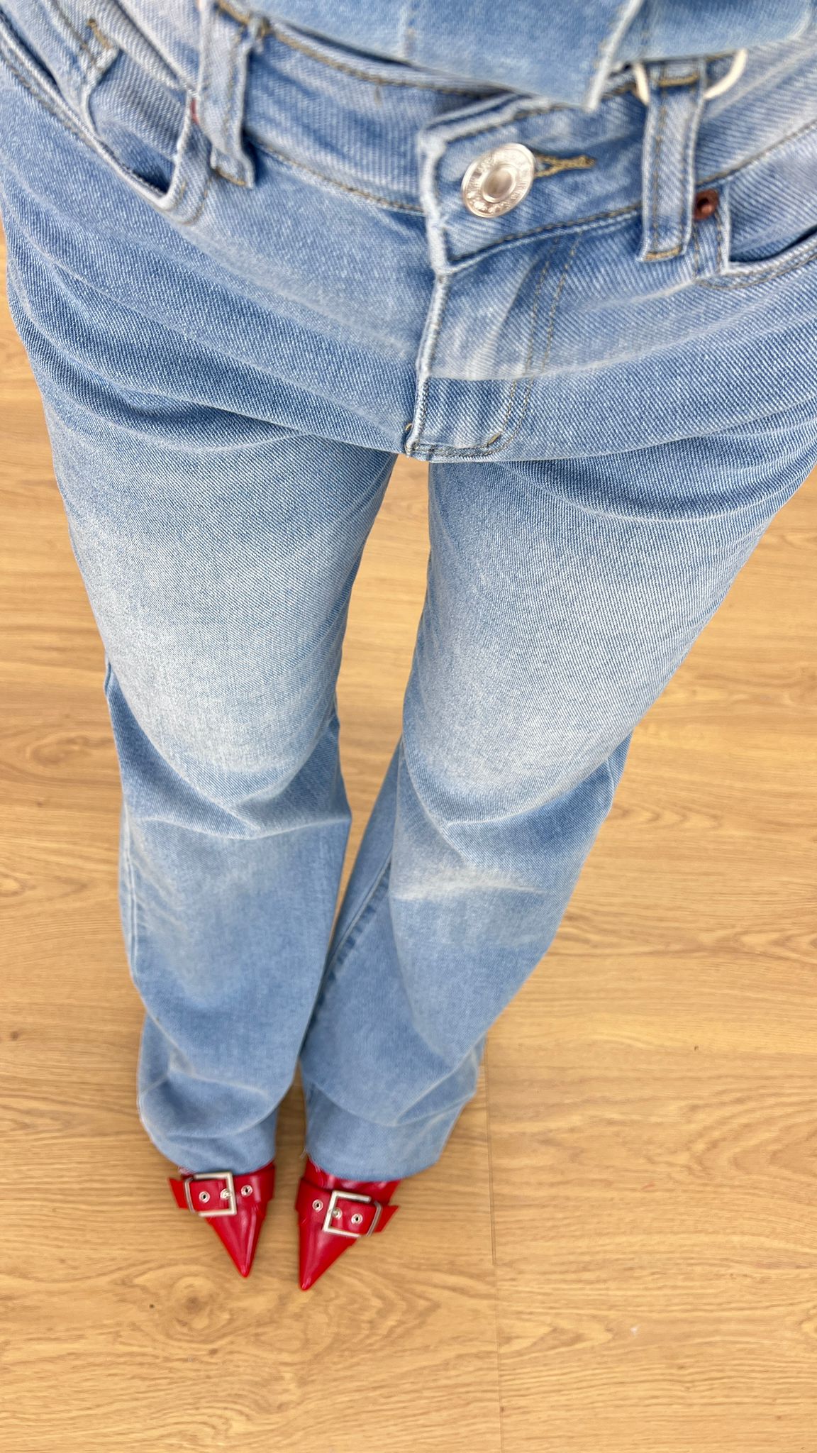 Jeans da donna in denim chiaro modello wide leg tessuto elasticizzato ma veste regolarmente la propria taglia e Giusy indossa taglia XS