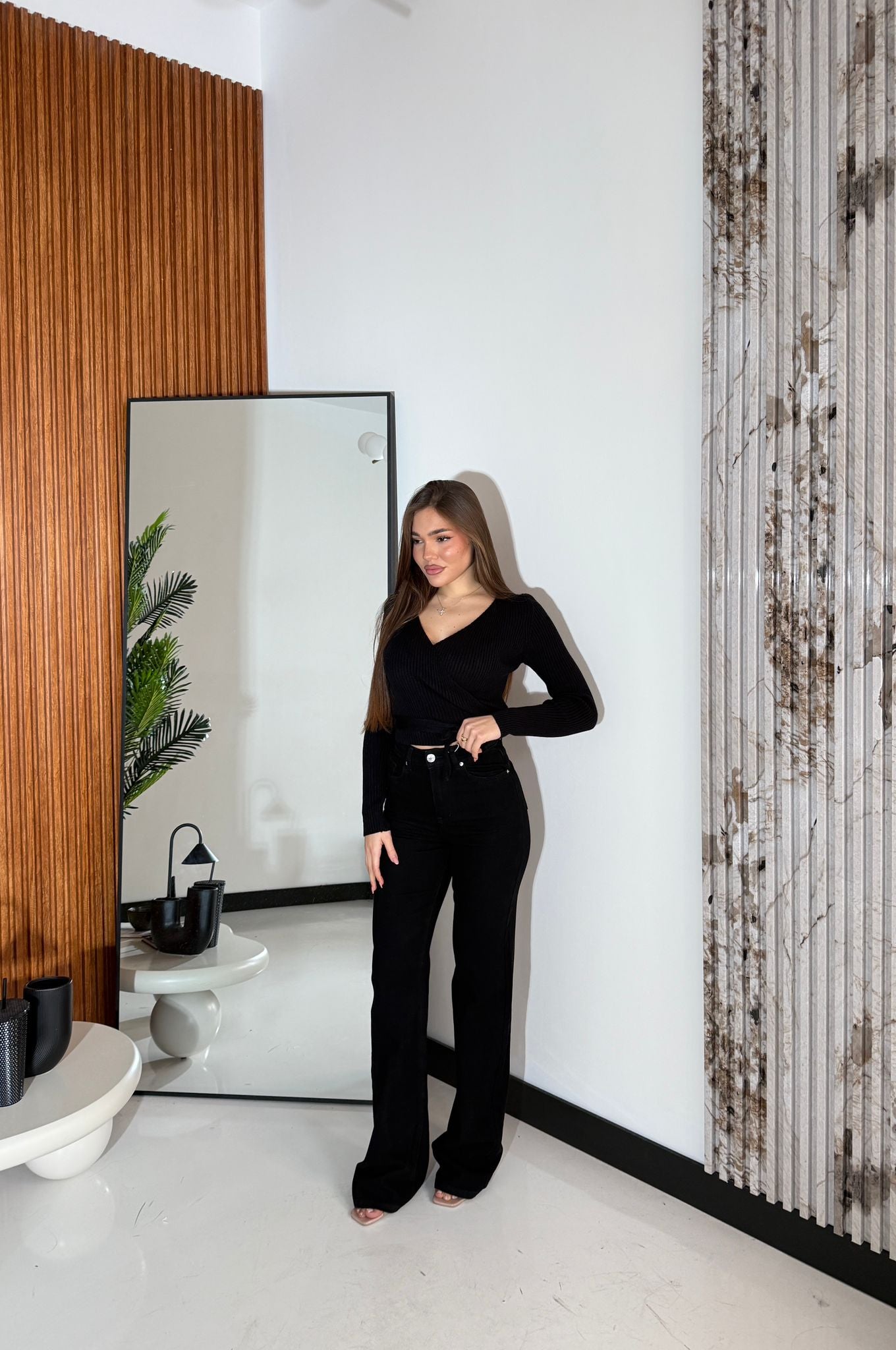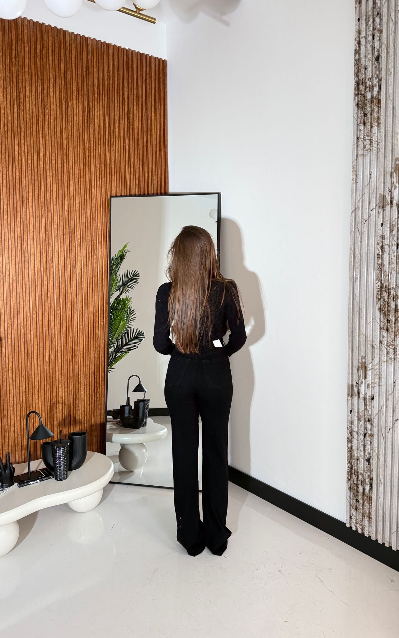 Jeans in denim nero tessuto elasticizzato a vita alta, modello wide-leg extra long ma veste bene la propria taglia e la modella indossa taglia XS ed è alta 1,65 cm e pesa 52/53 kg