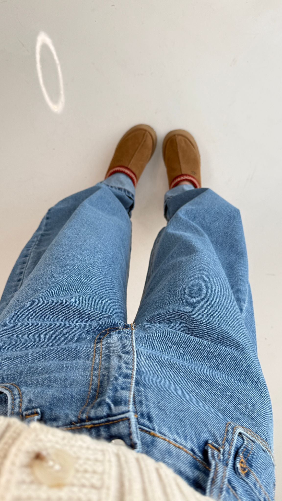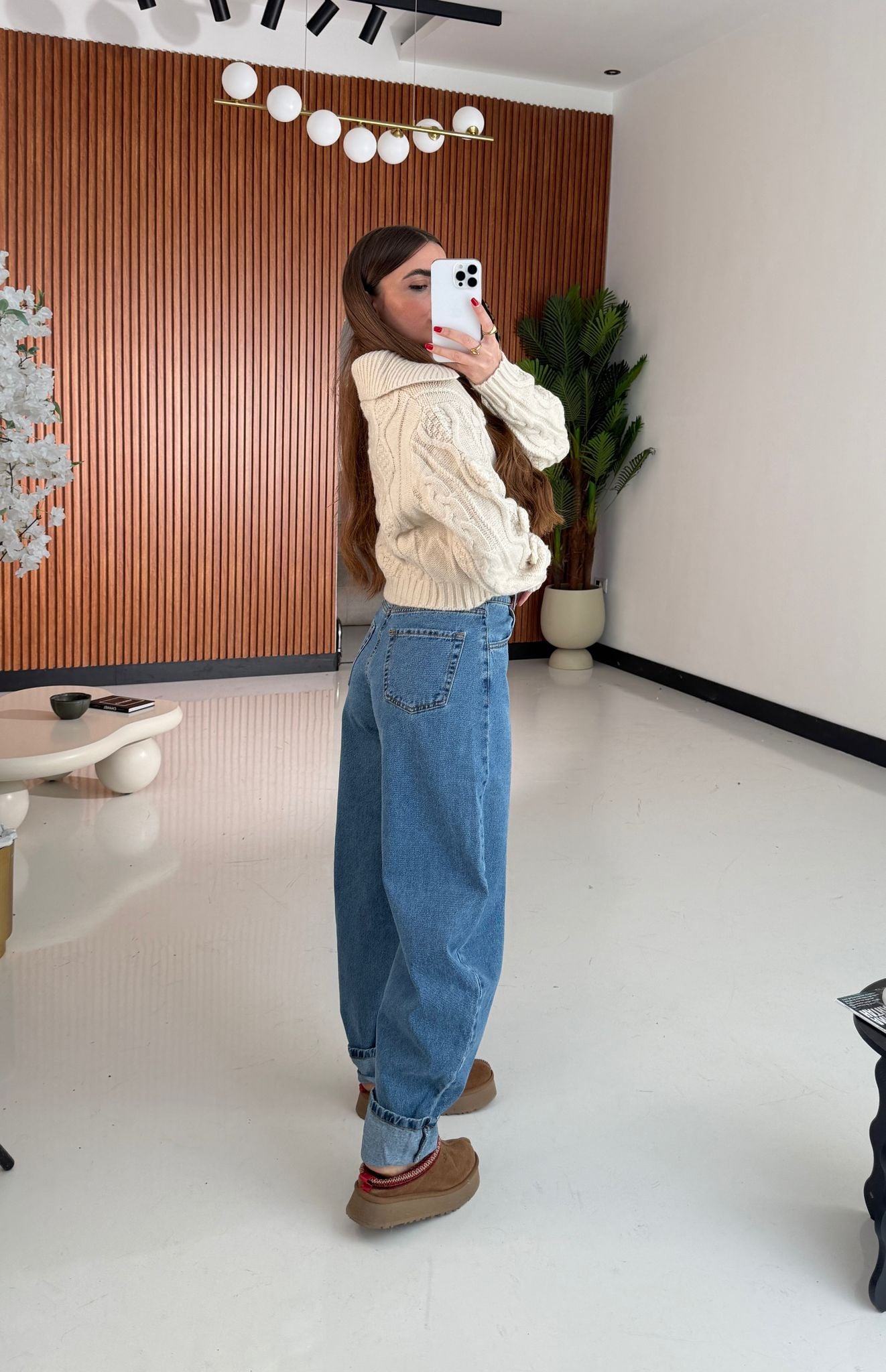 Jeans da donna in denim, modello balloon fit con piegone in tela fissa. Veste regolarmente la propria taglia, la modella in foto indossa taglia XS ed è alta 1,65 e pesa 52/53 kg.