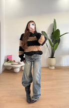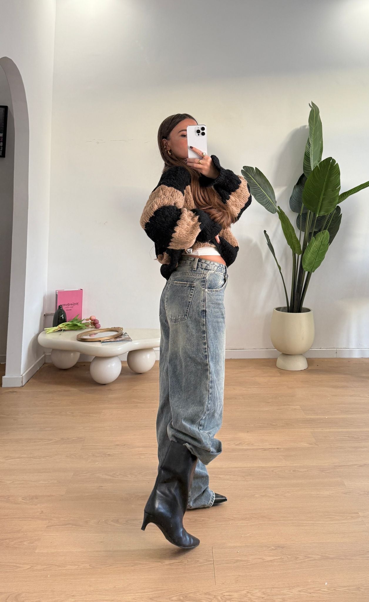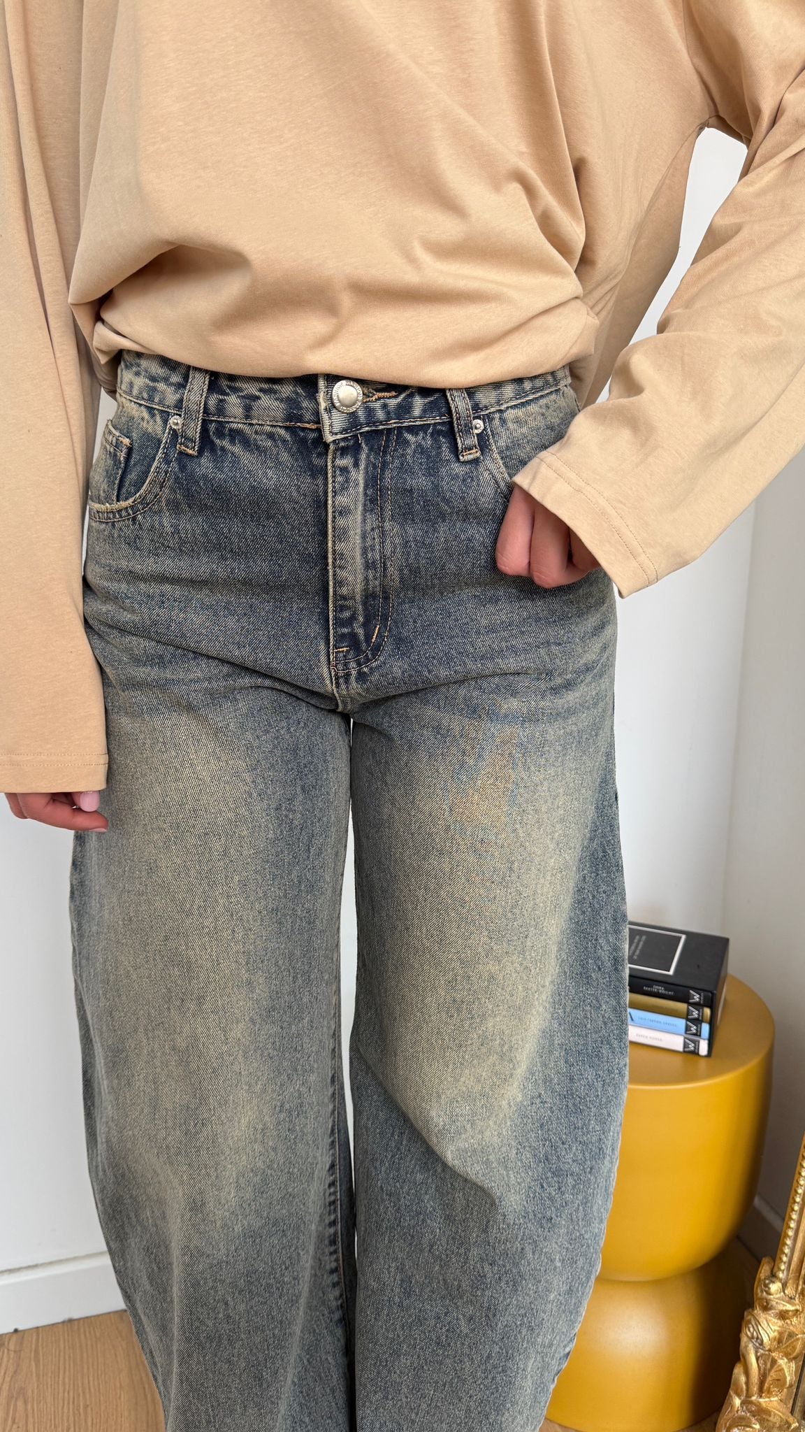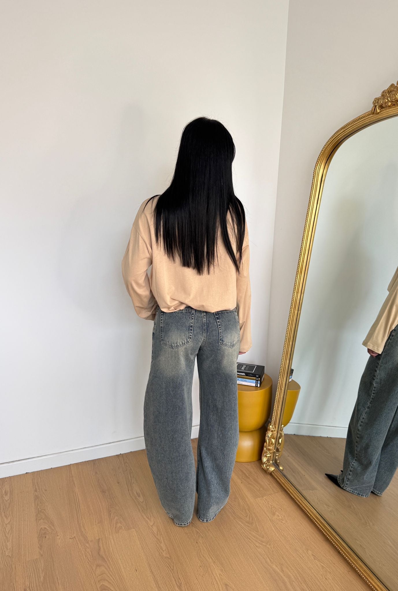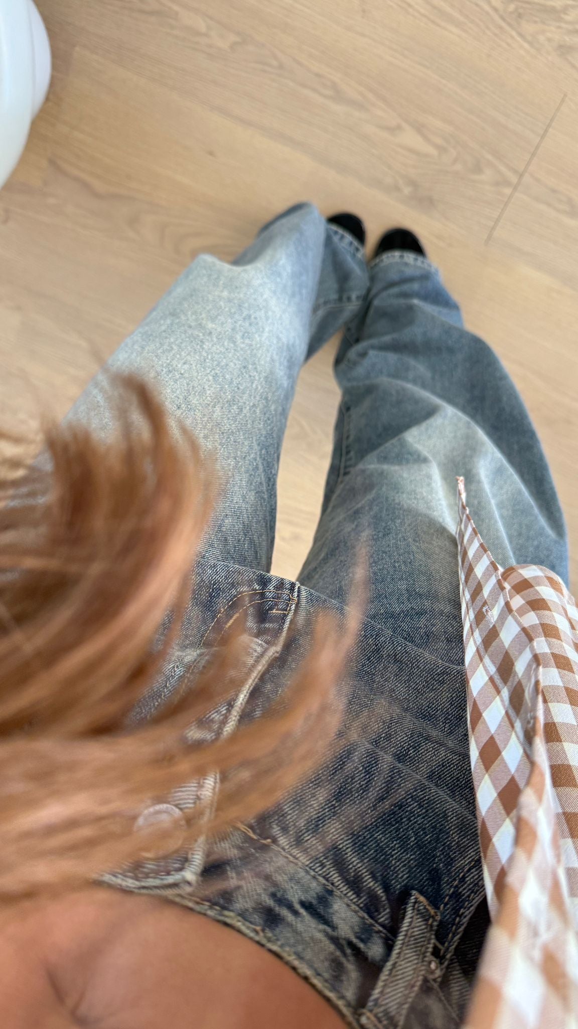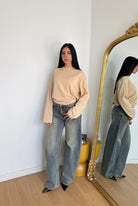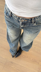 Jeans da donna in tela fissa, modello baggy carpenter e veste regolarmente la propria taglia, la modella indossa taglia XS