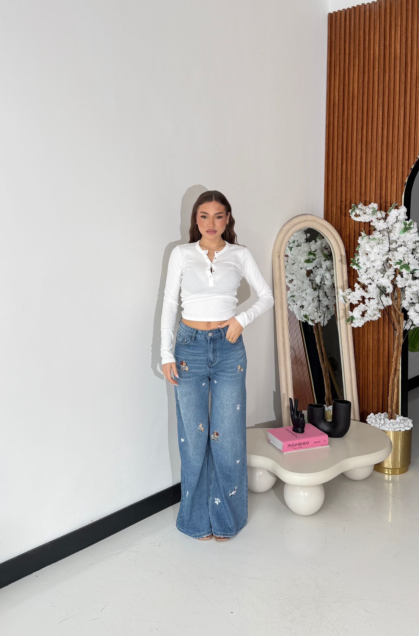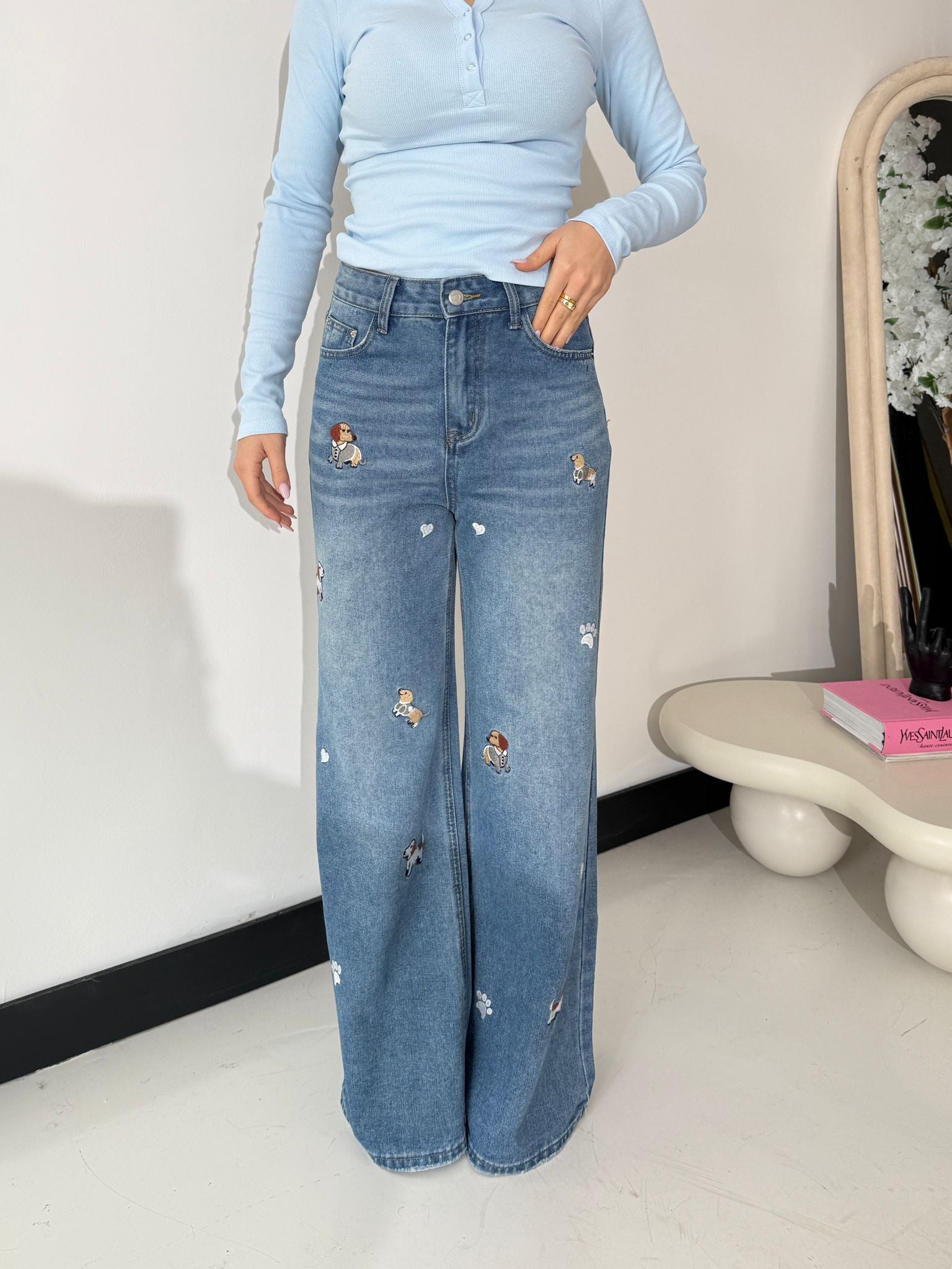 Jeans in denim in tela fissa non elasticizzato, modello a gamba larga con applicazione fantasia cagnolini. Veste regolarmente la propria taglia e la modella indossa taglia S ed è alta 1,65 cm e pesa 52/53 kg