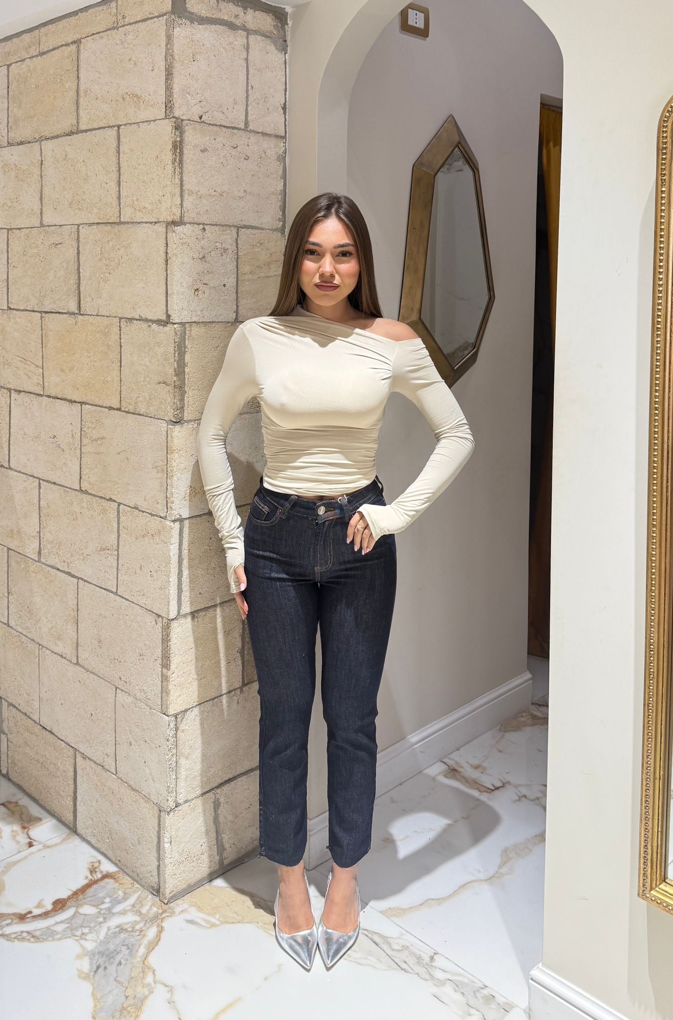 Jeans da donna in denim scuro tessuto elasticizzato con taglio laser sul finale e veste regolarmente la propria taglia e la modella indossa taglia XS