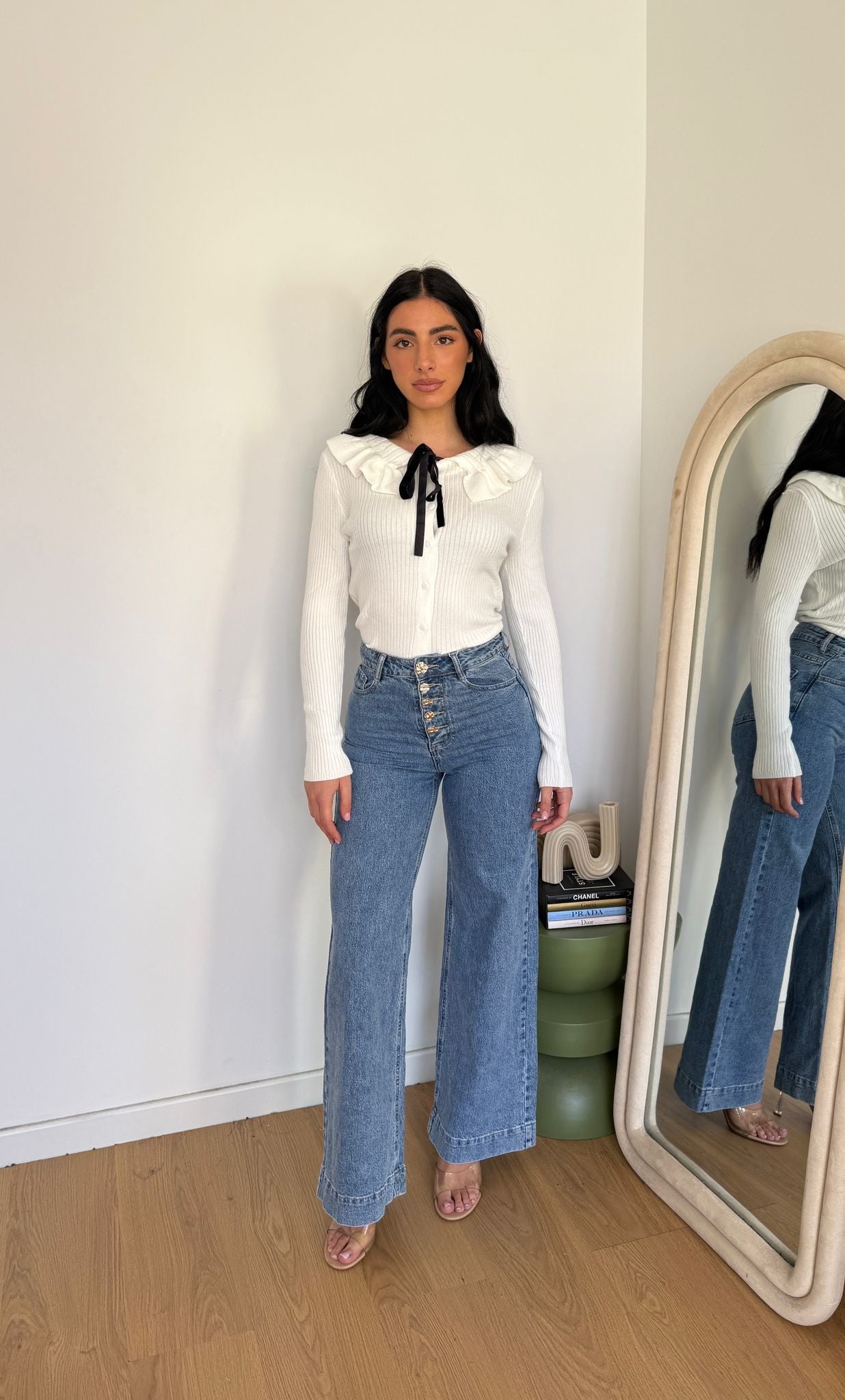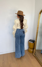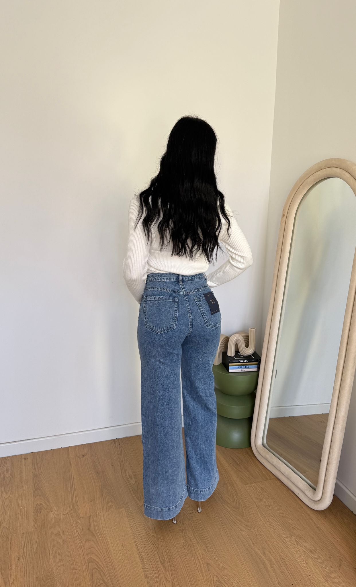 Jeans da donna in denim vita alta modello wide-leg, tessuto semi elasticizzato e veste regolarmente la propria taglia e la modella indossa taglia XS