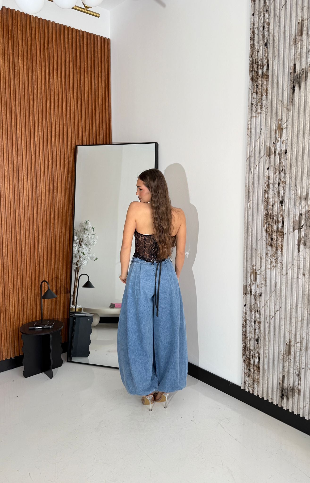 Jeans in denim, modello ampio balloon fit con elastico sul finale, tessuto tela fissa. Veste regolarmente la propria taglia, la modella indossa taglia S ed è alta 1,65 e pesa 52/53 kg.