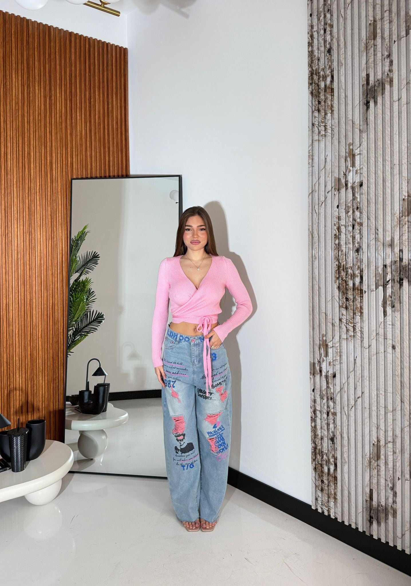 Jeans in denim in tela fissa con taglio laser sul finale, con particolarità strappi e scritte. Veste bene la propria taglia e la modella indossa taglia XS ed è alta 1,65 cm e pesa 52/53 kg