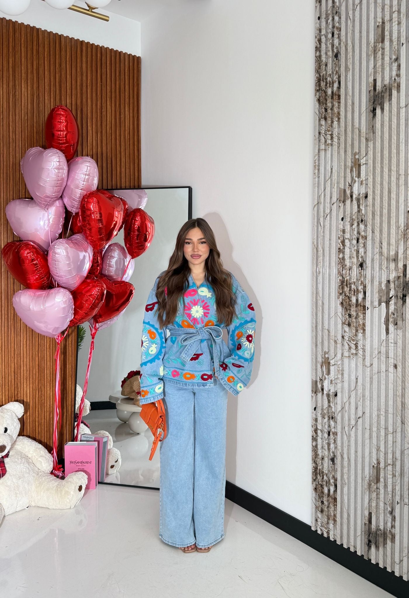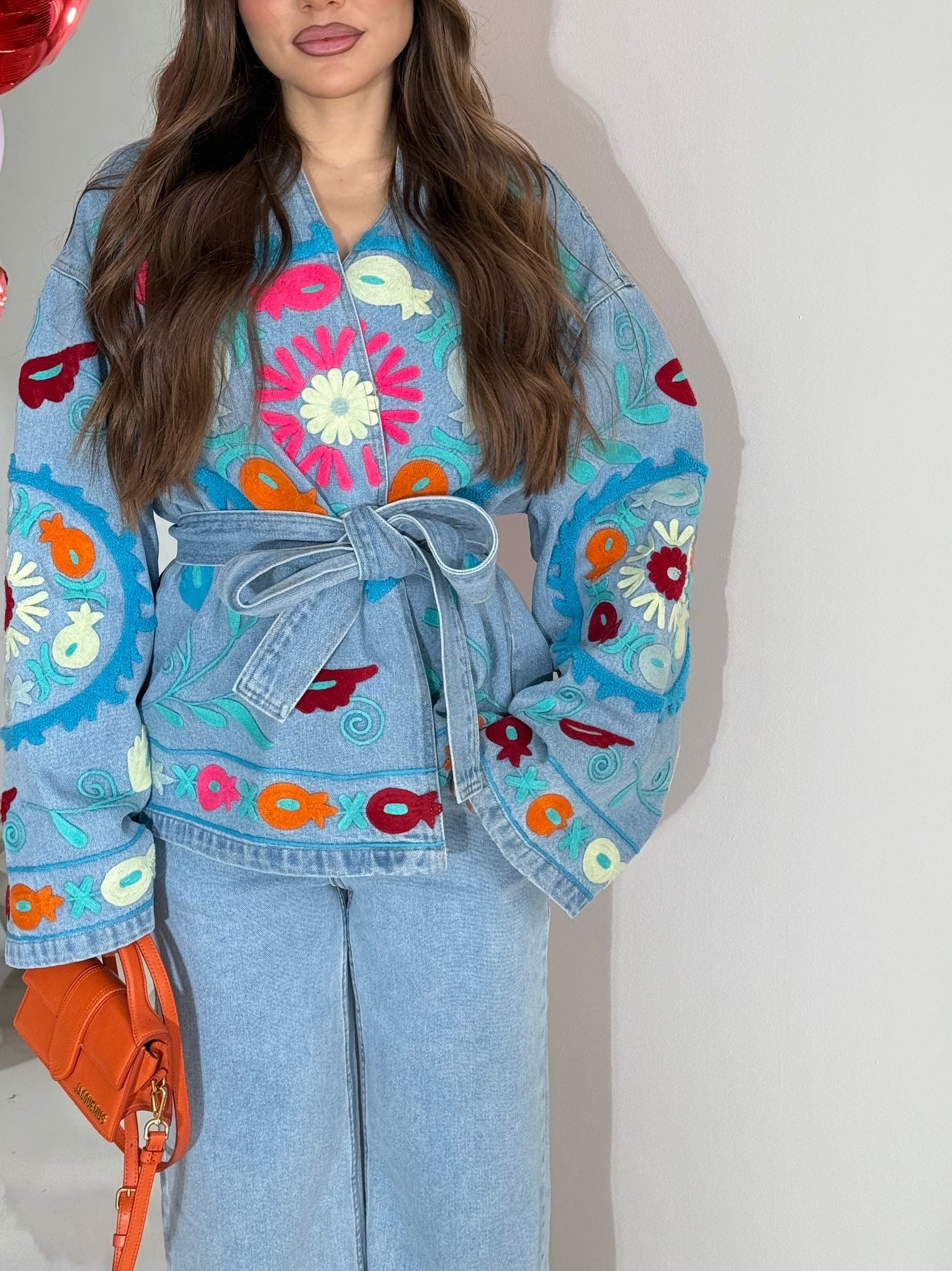 Kimono/giacca da donna in denim, modello oversize, con cintura compresa. Taglia unica, veste bene fino ad una L/XL. La modella è alta 1,65 e pesa 52/53kg.
