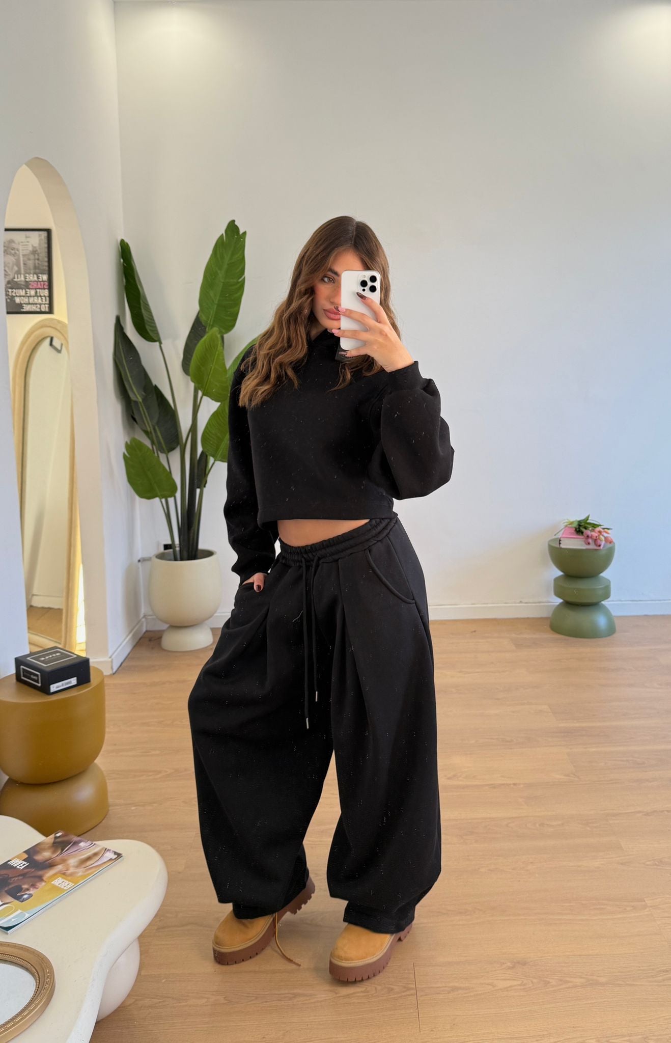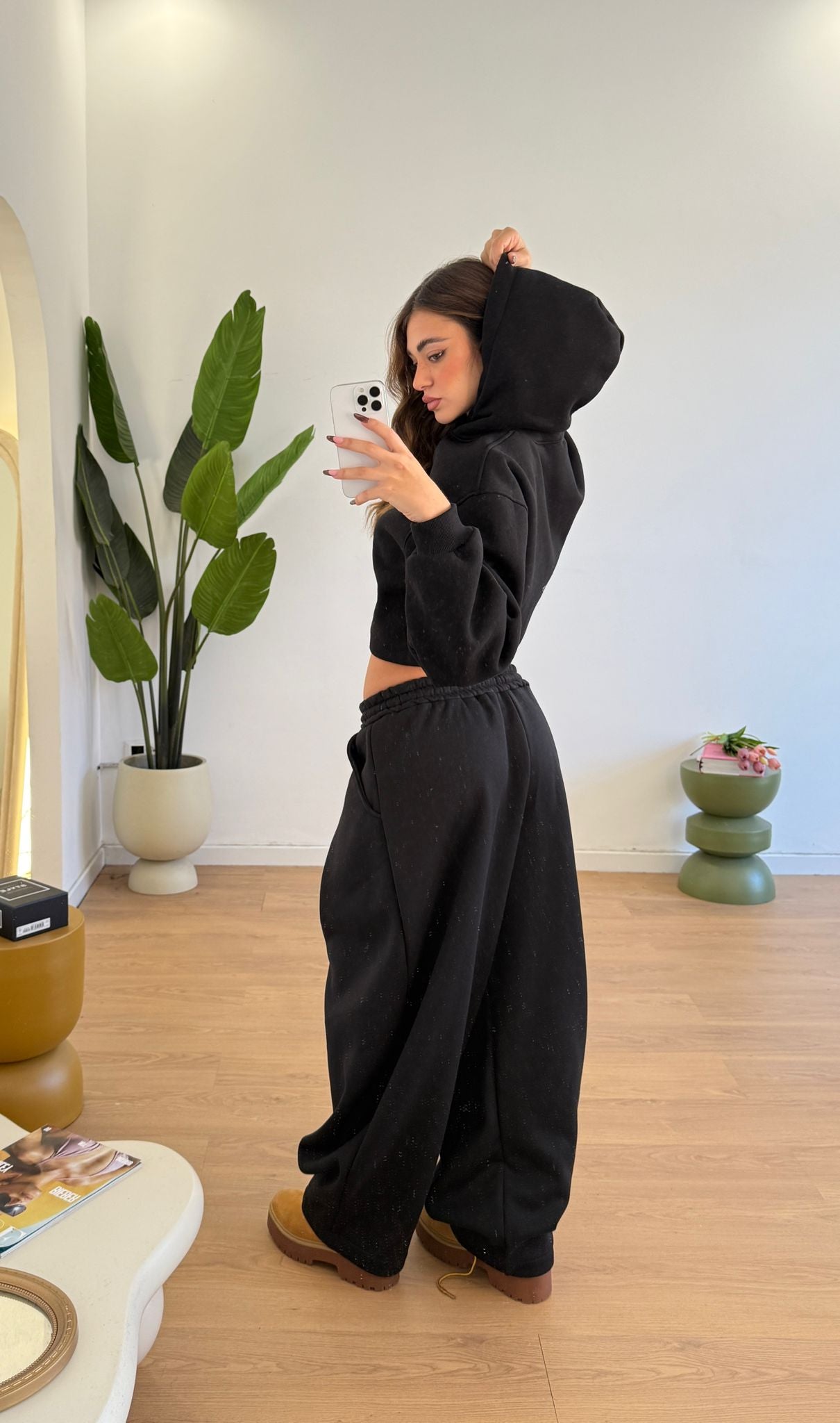 Coordinato da donna felpati internamente, composto da felpa con cappuccio, polsini ed elastico sul retro e da pantalone gamba larga, elastico in vita e laccetti regolabili. Taglia unica, veste bene fino ad una taglia 46.