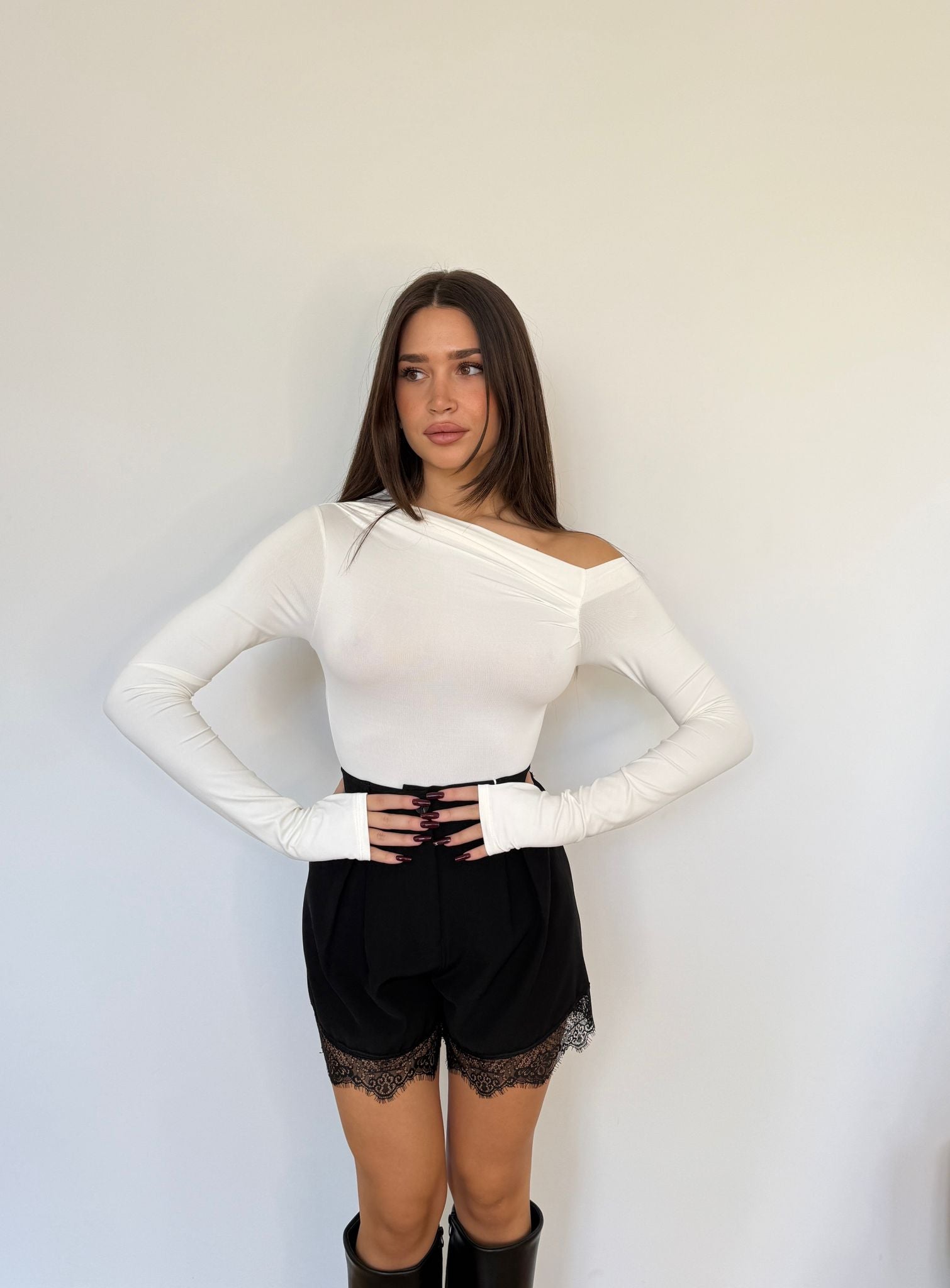 maglia da donna in licra con arricciatura sulla parte iniziale,si può' indossare anche in modo simmetrica