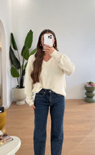 Maglioncino da donna oversize in lana rasata morbida, scollo a V, vestibilità fino ad una M/L.