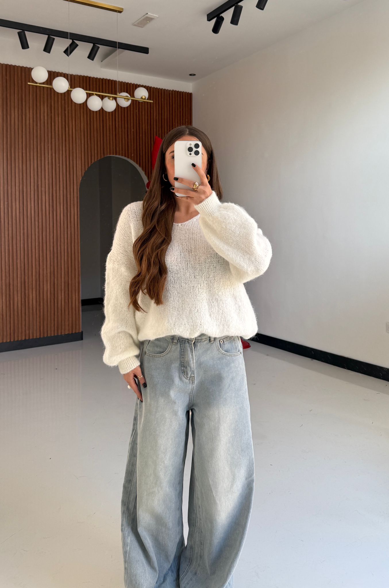 Maglione da donna in lana rasata con polsini e manica leggermente a sbuffo, vestibilità oversize e tessuto elasticizzato, vestirà bene fino ad una M/L piena