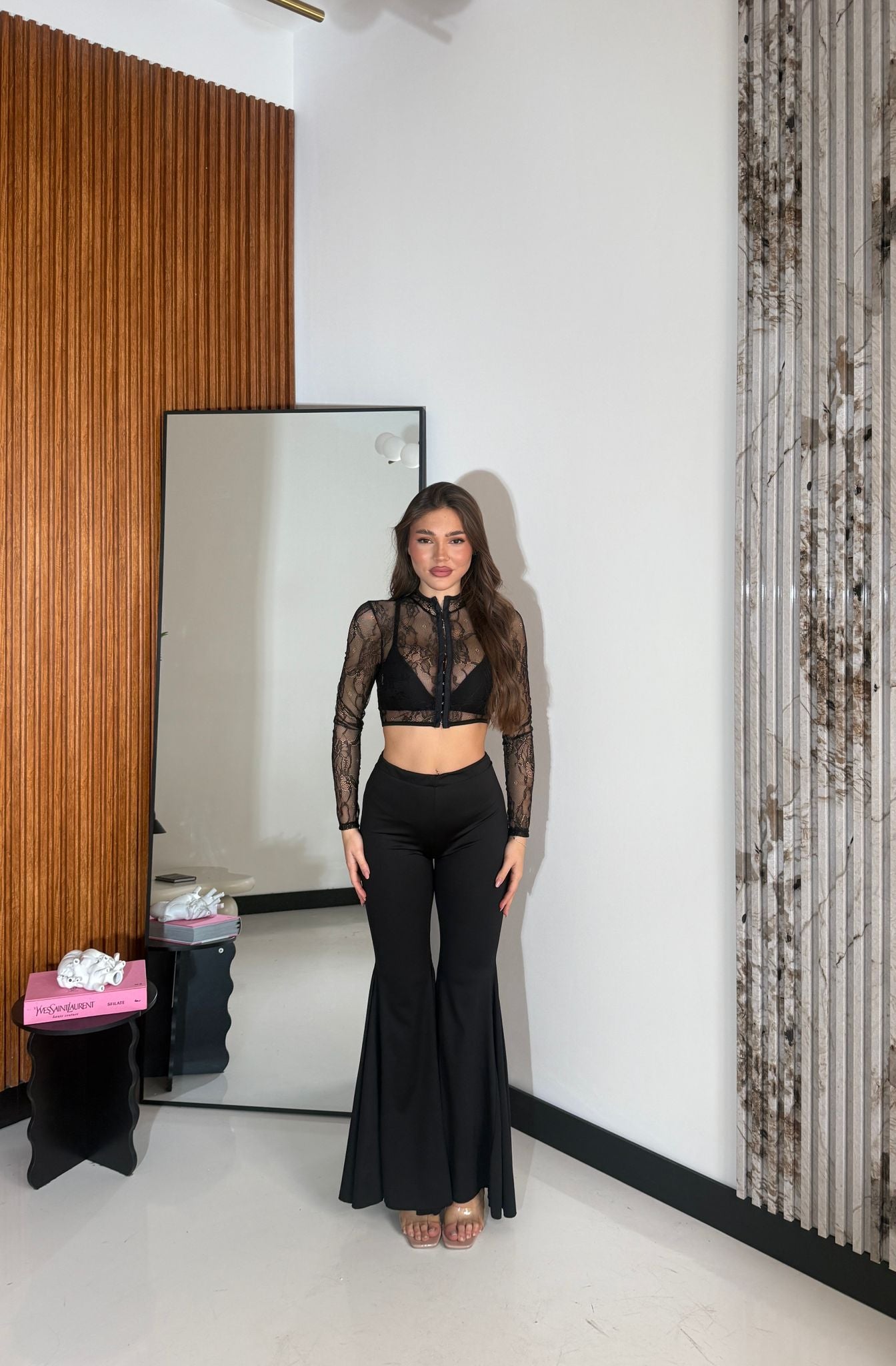 Pantalone da donna in lycra con elastico in vita, modello a gamba pipistrello molto largo. Tessuto elasticizzato e veste bene fino ad una M/L. La modella è alta 1,65 e pesa 52/53 kg.