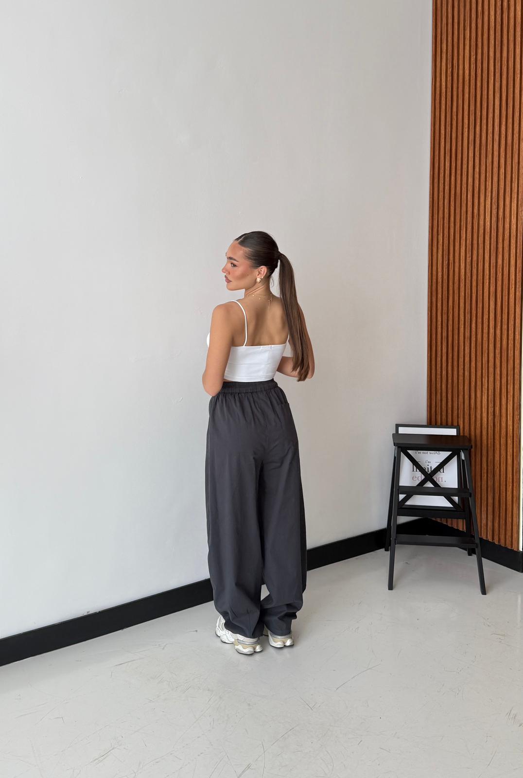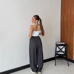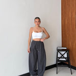 Pantalone modello cargo con elastico in vita, laccio regolabile e tasche laterali. Veste regolarmente la propria taglia, la modella indossa taglia S/M ed è alta 1,65 cm e pesa 52/53kg.