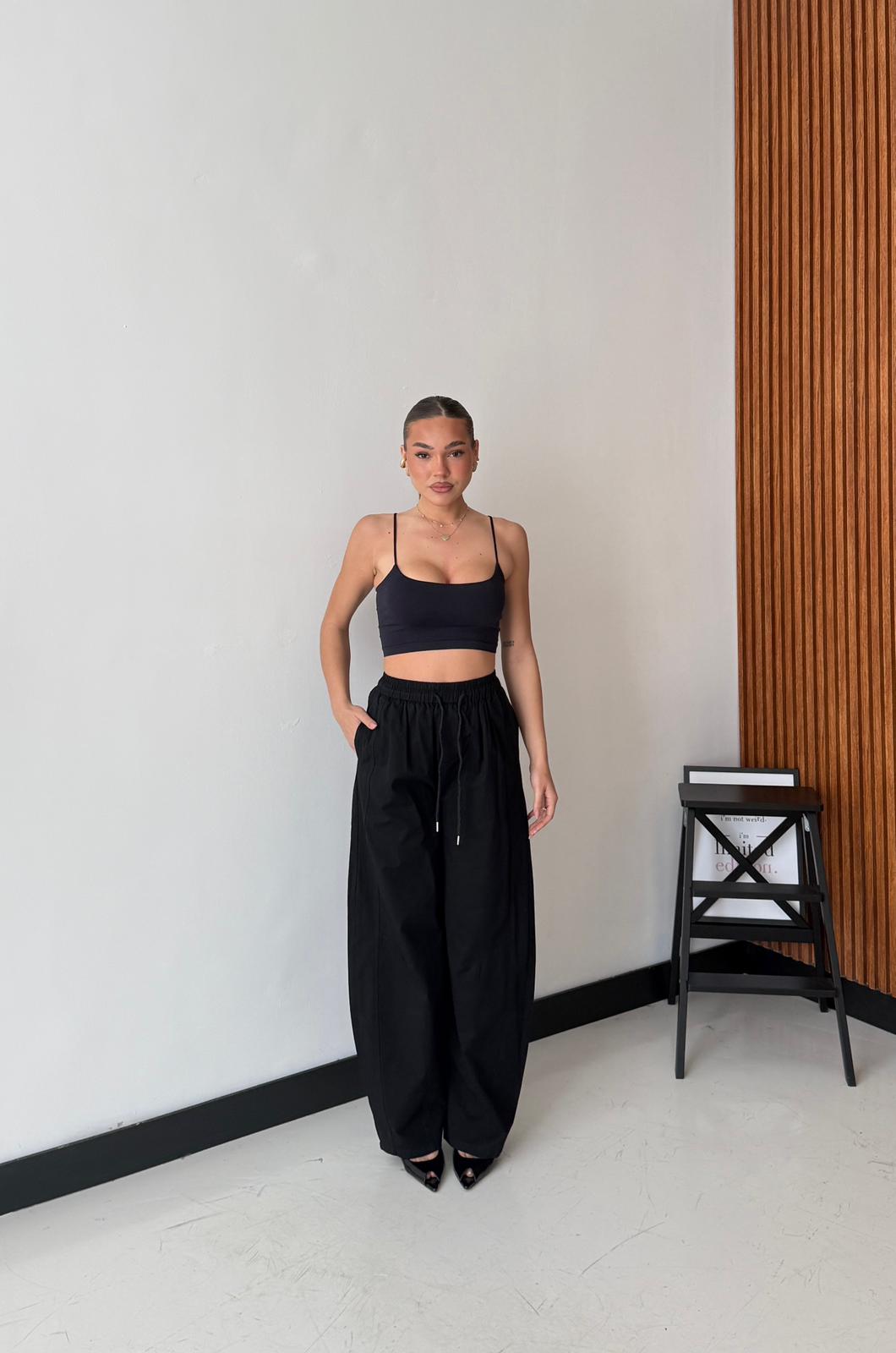 Pantalone modello cargo con elastico in vita, laccio regolabile e tasche laterali. Veste regolarmente la propria taglia, la modella indossa taglia S/M ed è alta 1,65 cm e pesa 52/53kg.