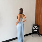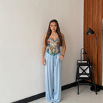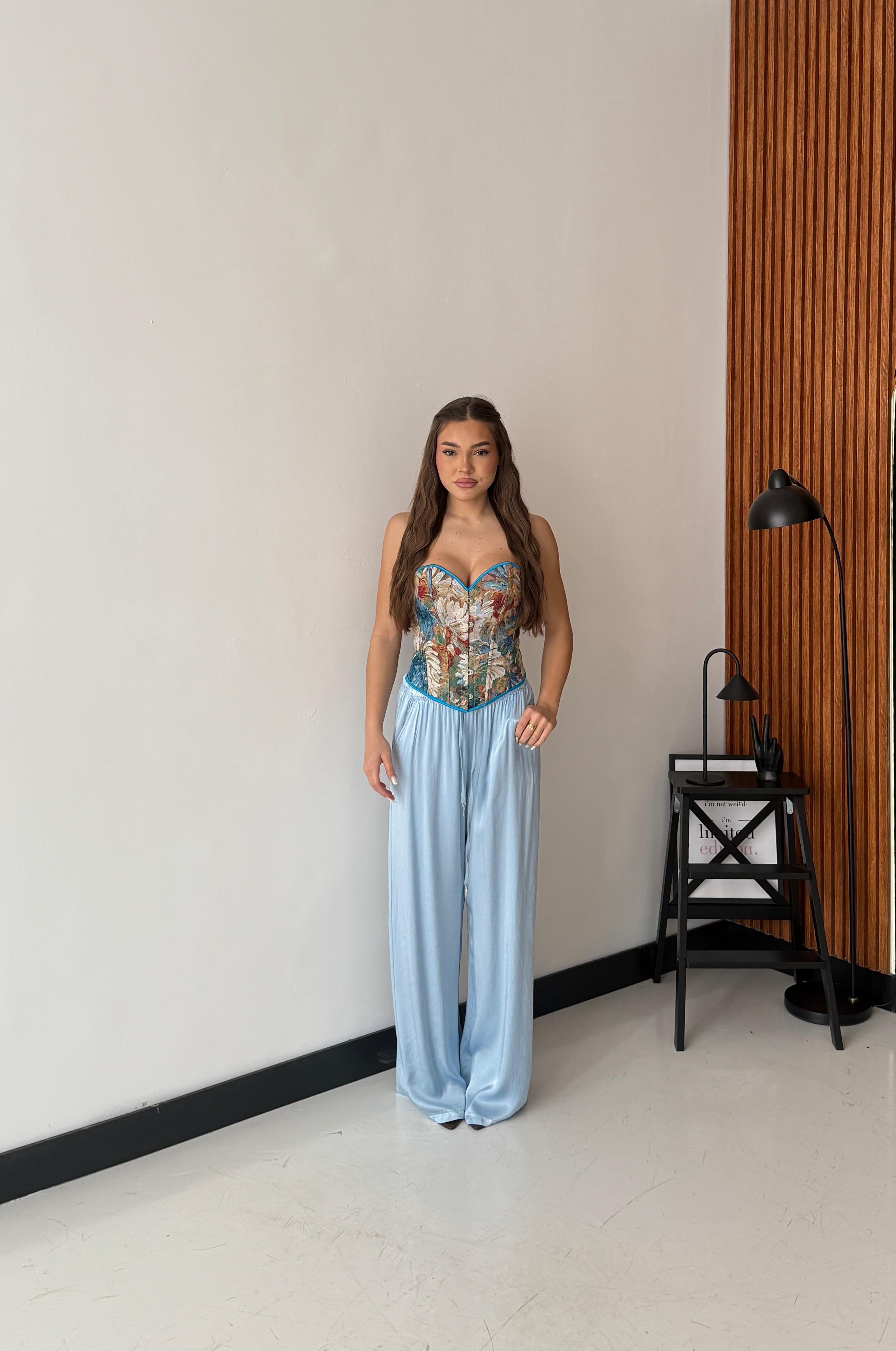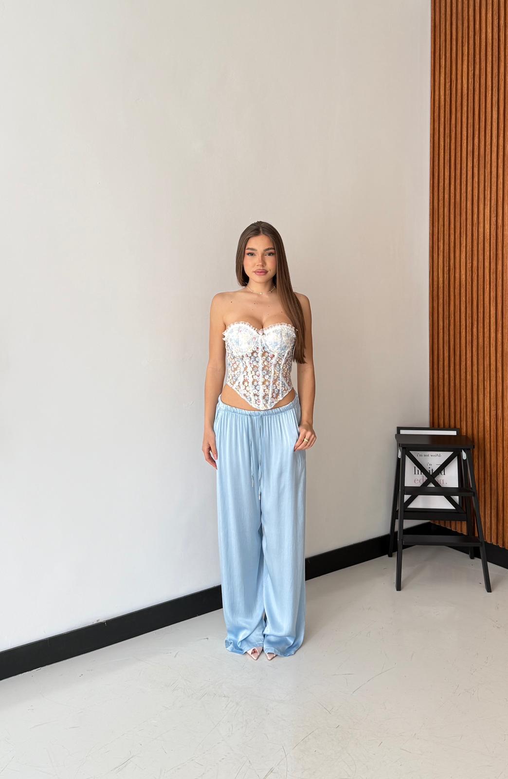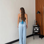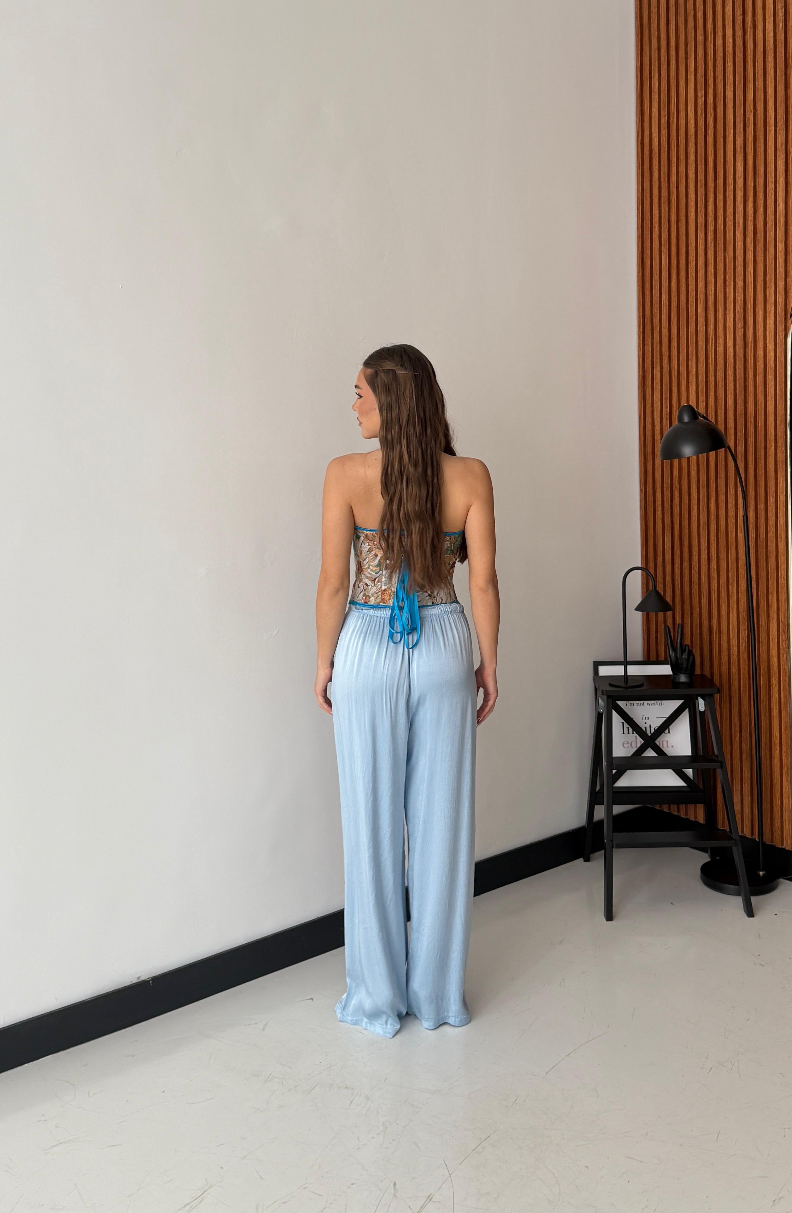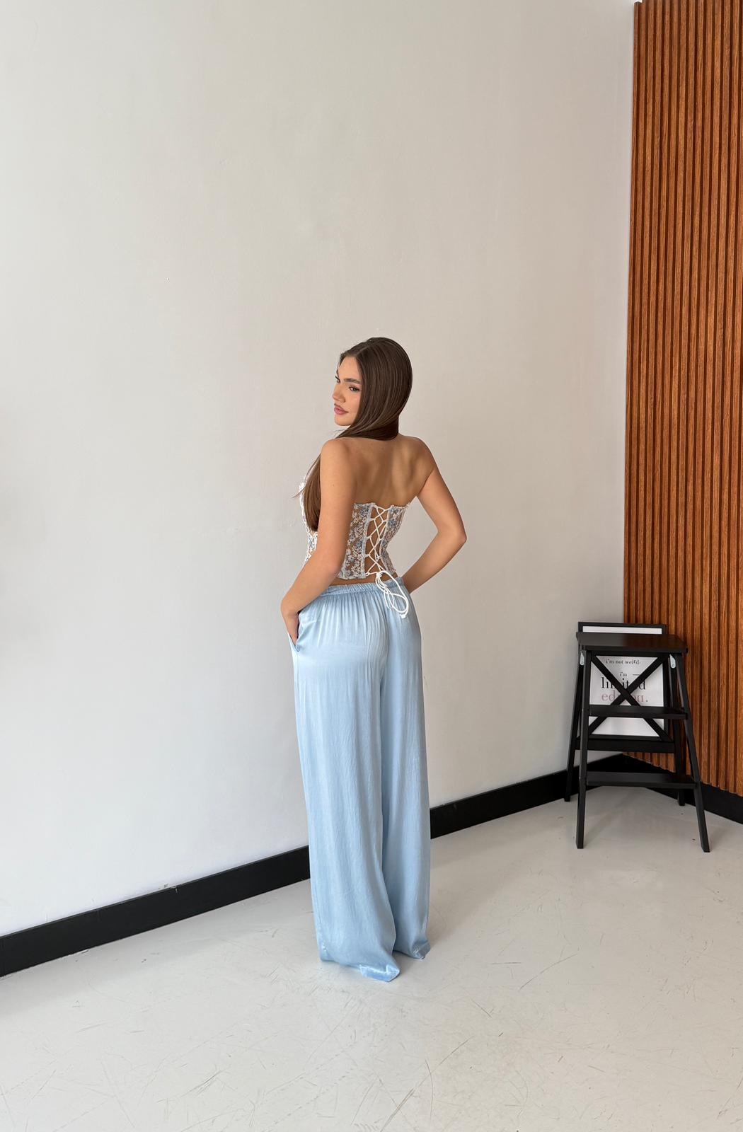 Pantalone da donna in tessuto morbido effetto satin, con elastico in vita e laccio regolabile. Taglia unica, veste bene fino ad una taglia M/L. La modella è alta 1,65 e pesa 52/53kg.