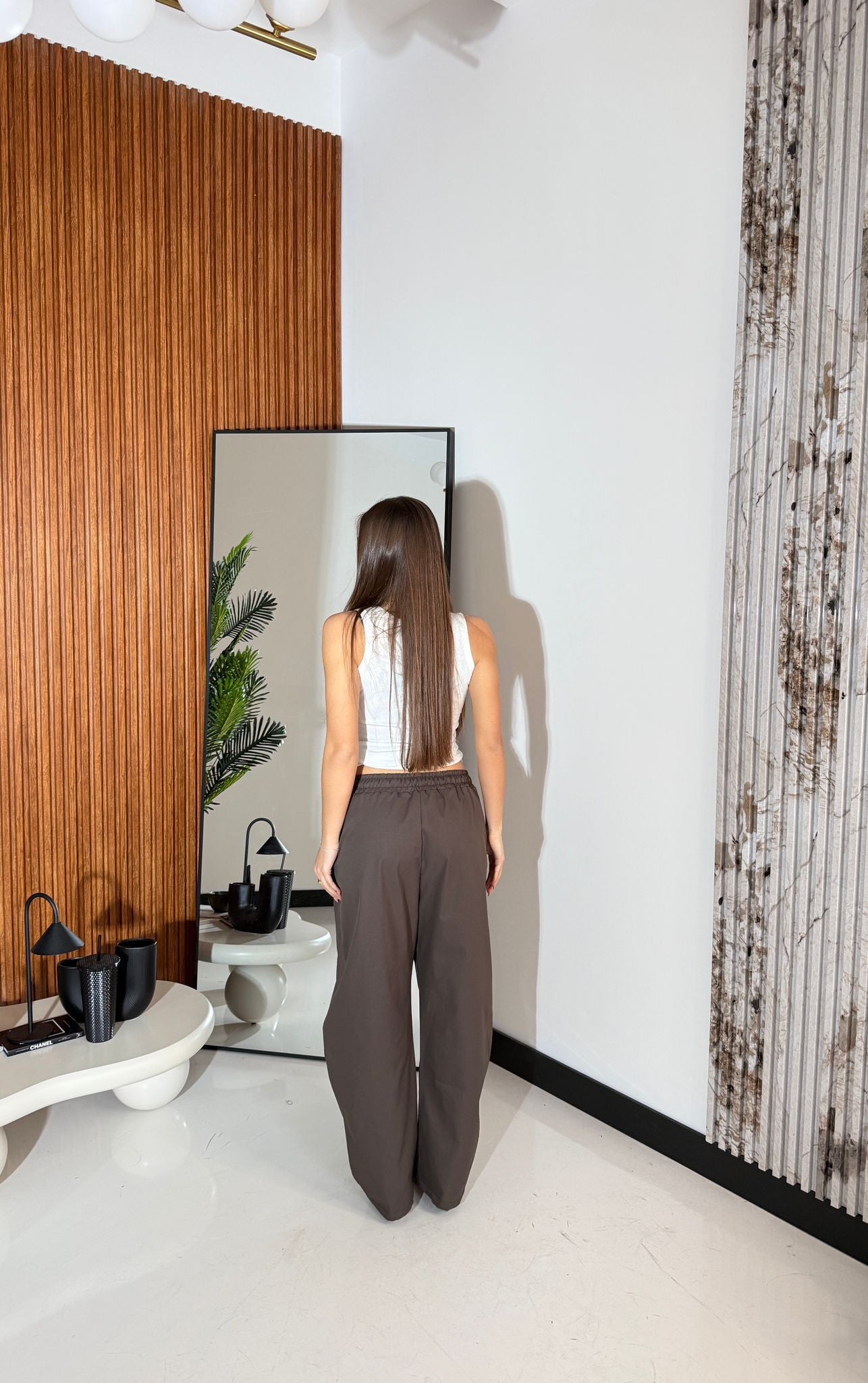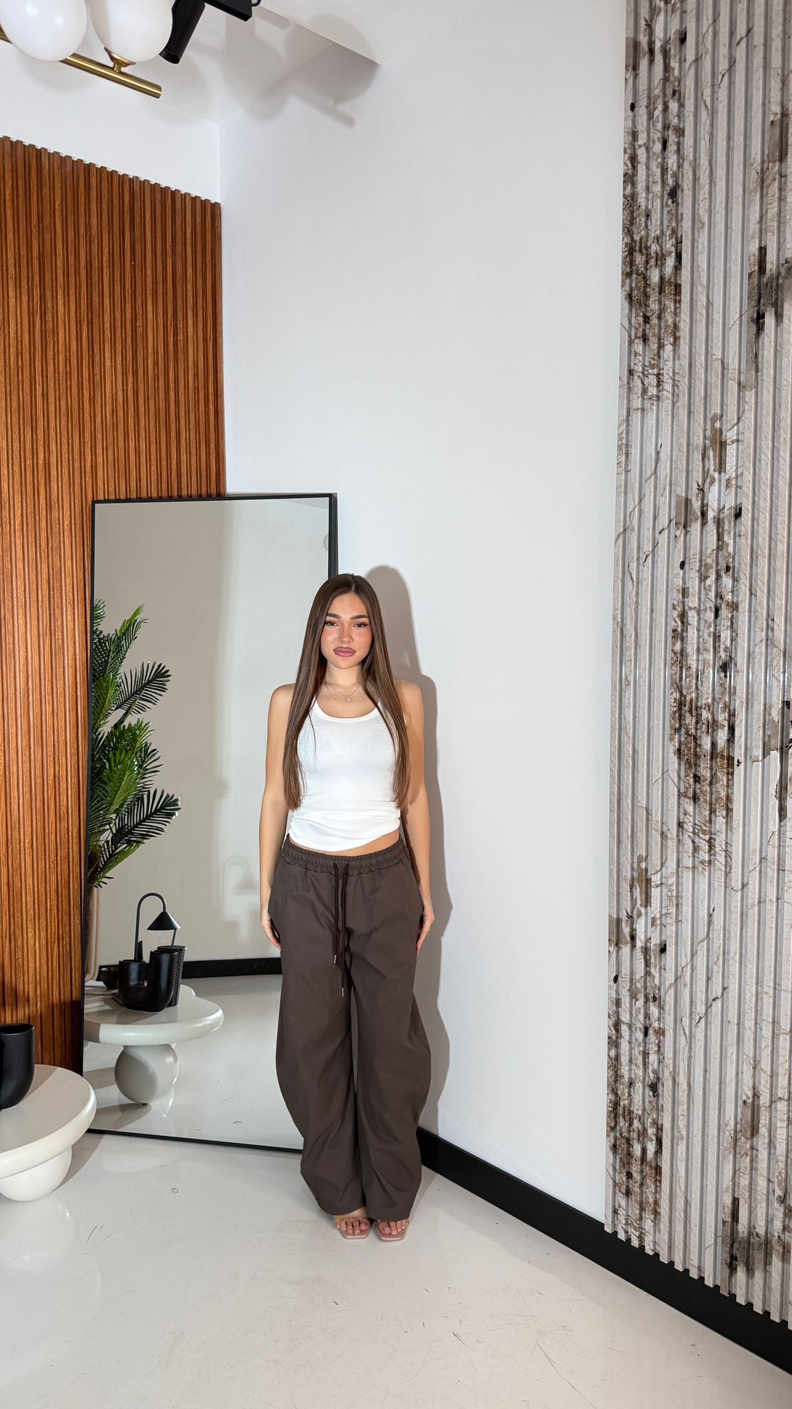 Pantalone modello ballon con elastico in vita e laccio regolabile, vestirà bene fino ad una M/L e la modella è alta 1,65 cm e pesa 52/53 kg