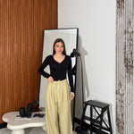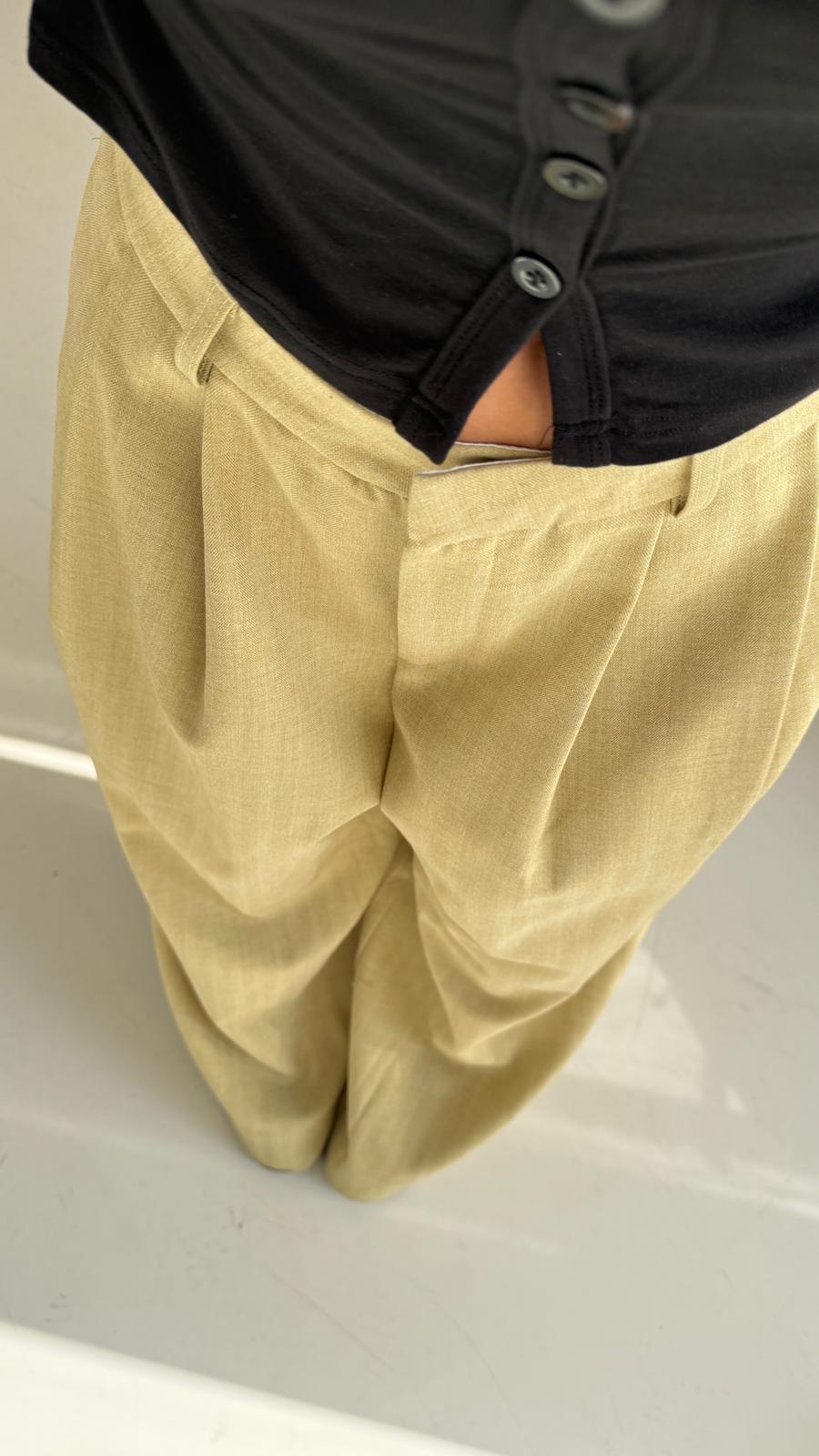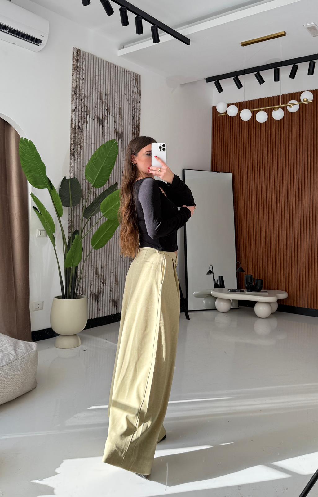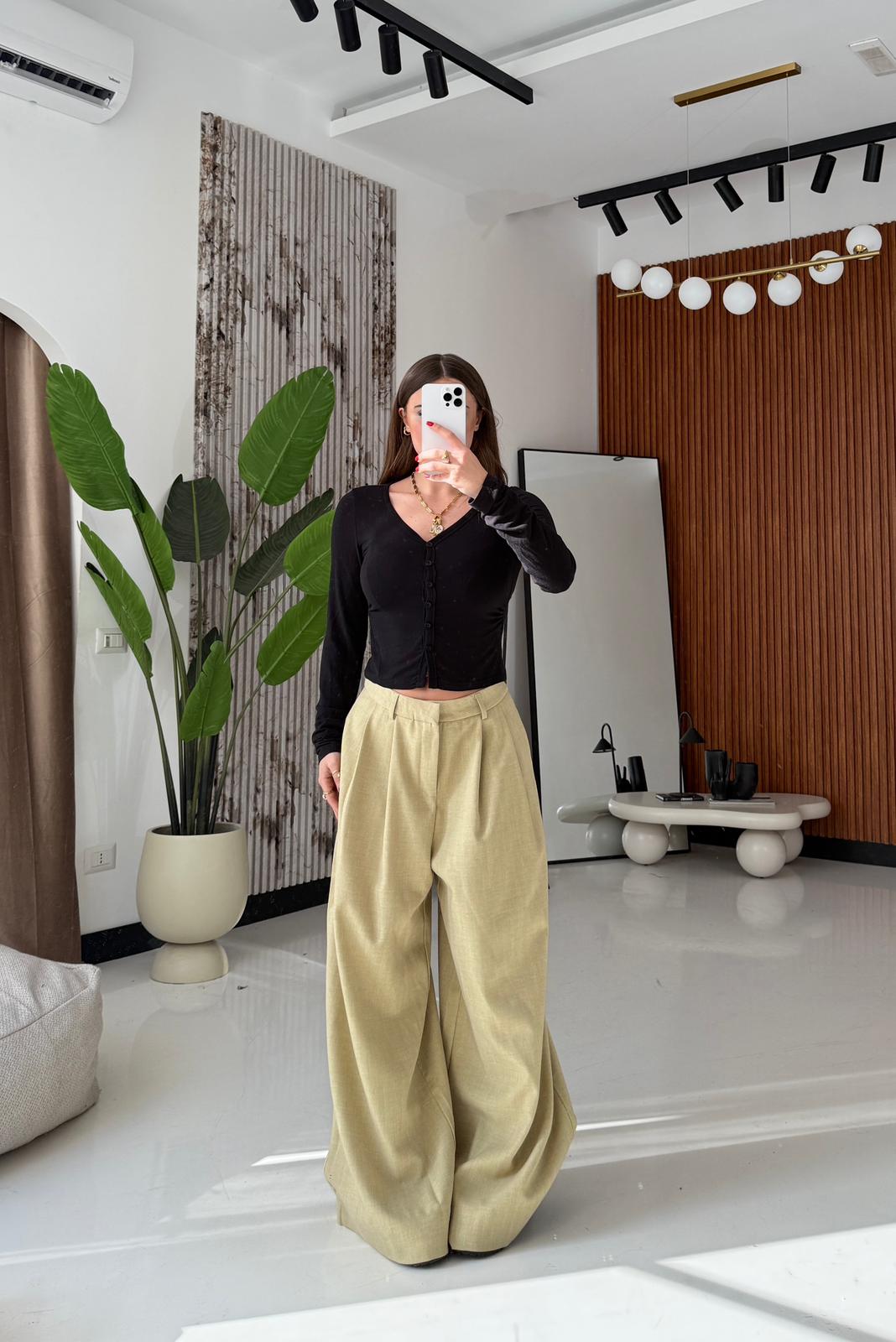 Pantalone in cotone, gamba larga, con tasche laterali e chiusura a gancetto sul davanti. Veste regolarmente la propria taglia, la modella in foto indossa taglia S ed è alta 1,65 e pesa 52/53kg.