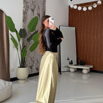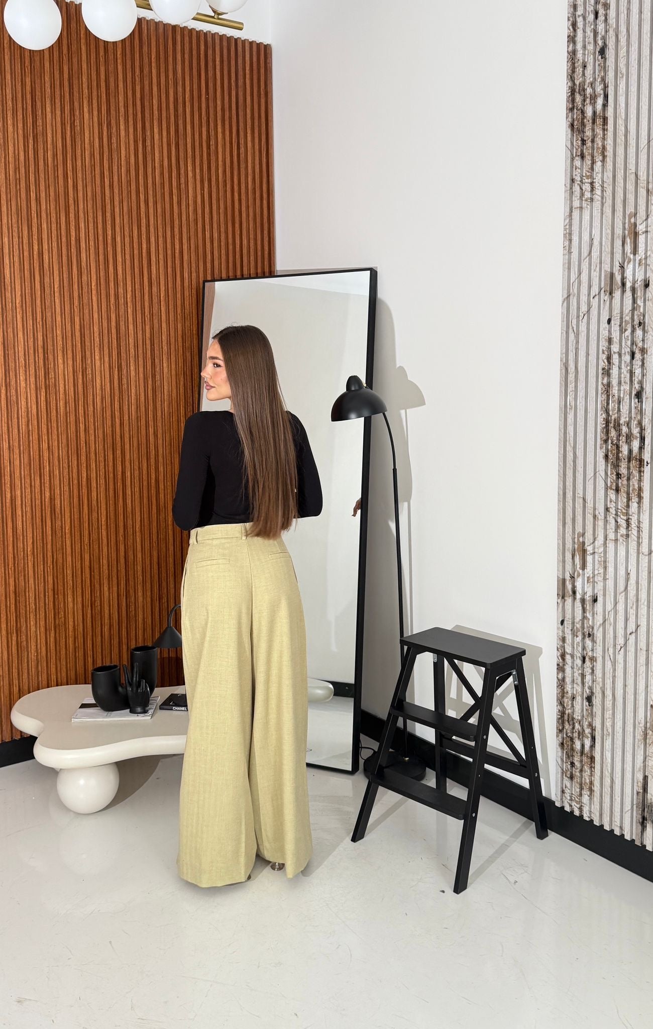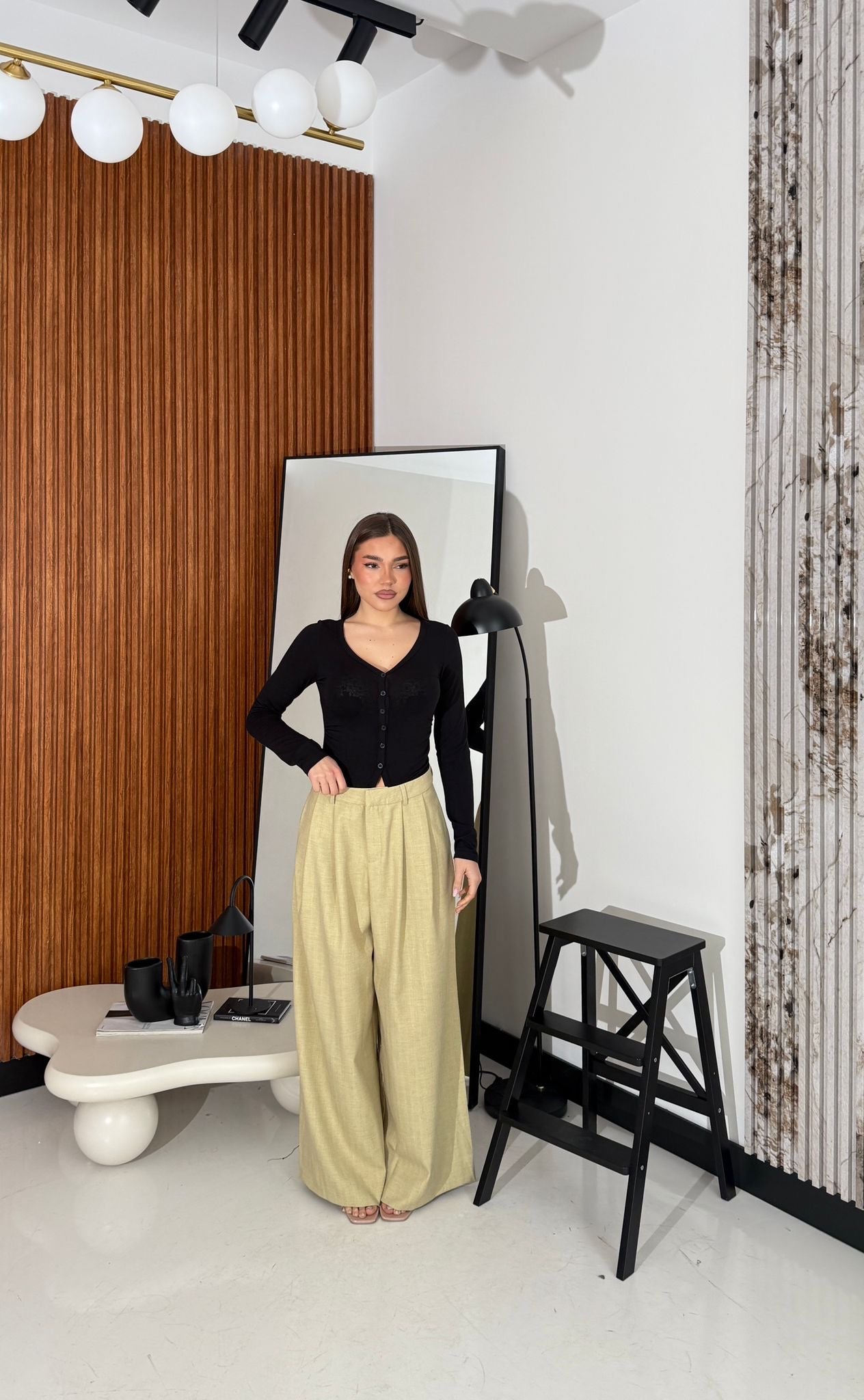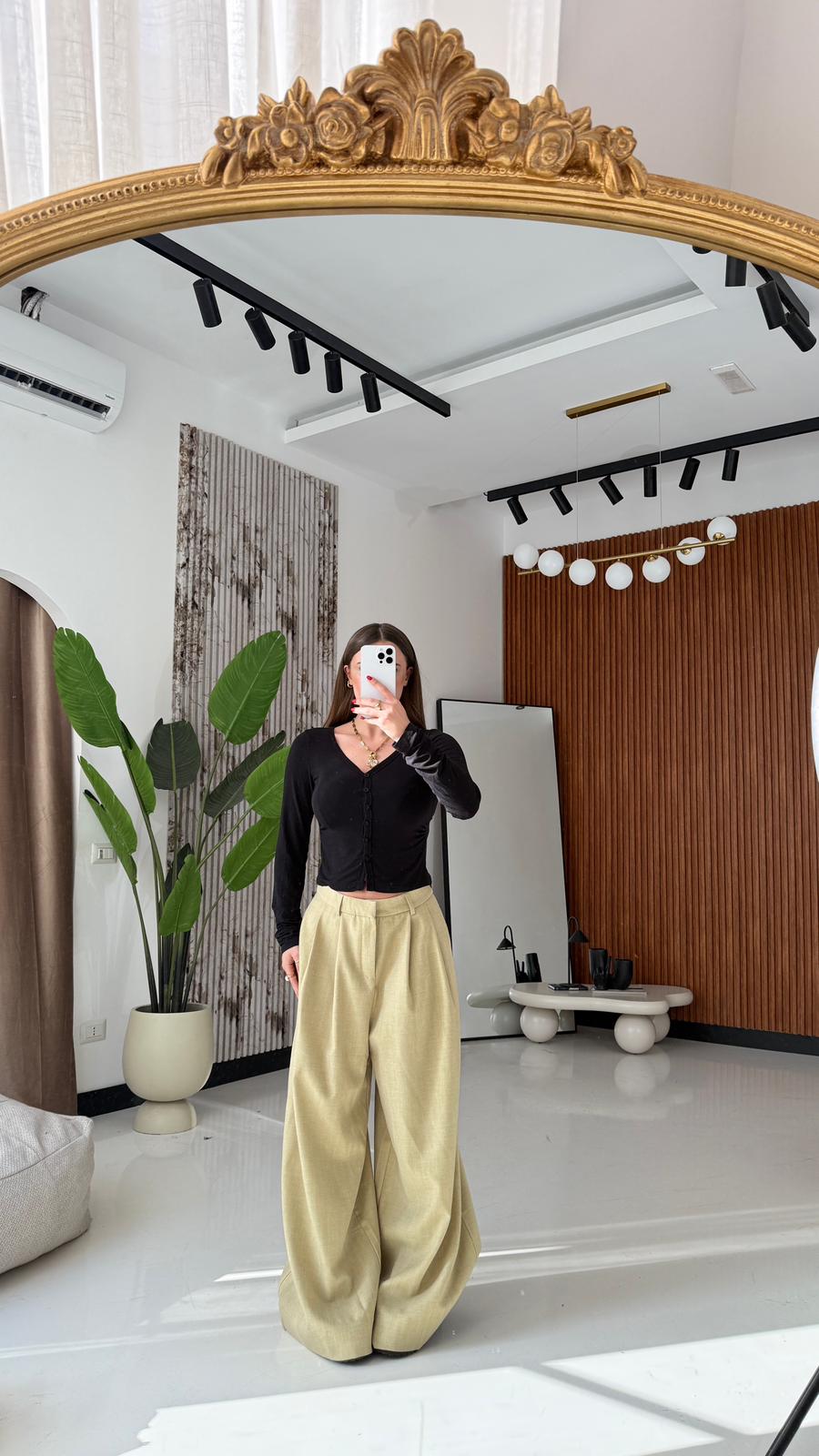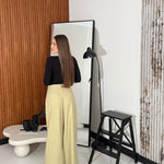 Pantalone in cotone, gamba larga, con tasche laterali e chiusura a gancetto sul davanti. Veste regolarmente la propria taglia, la modella in foto indossa taglia S ed è alta 1,65 e pesa 52/53kg.