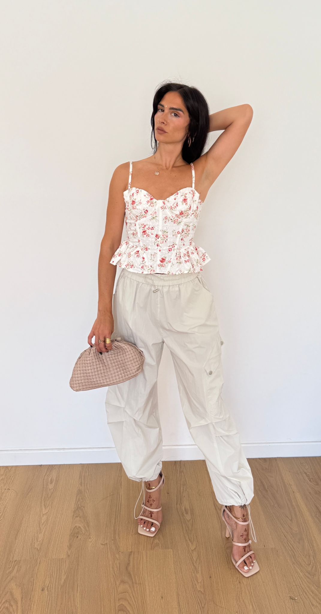 Pantalone da donna modello cargo tessuto leggero con elastico in vita e coulisse regolabile sul finale, veste regolarmente la propria taglia e Giusy indossa taglia S/M