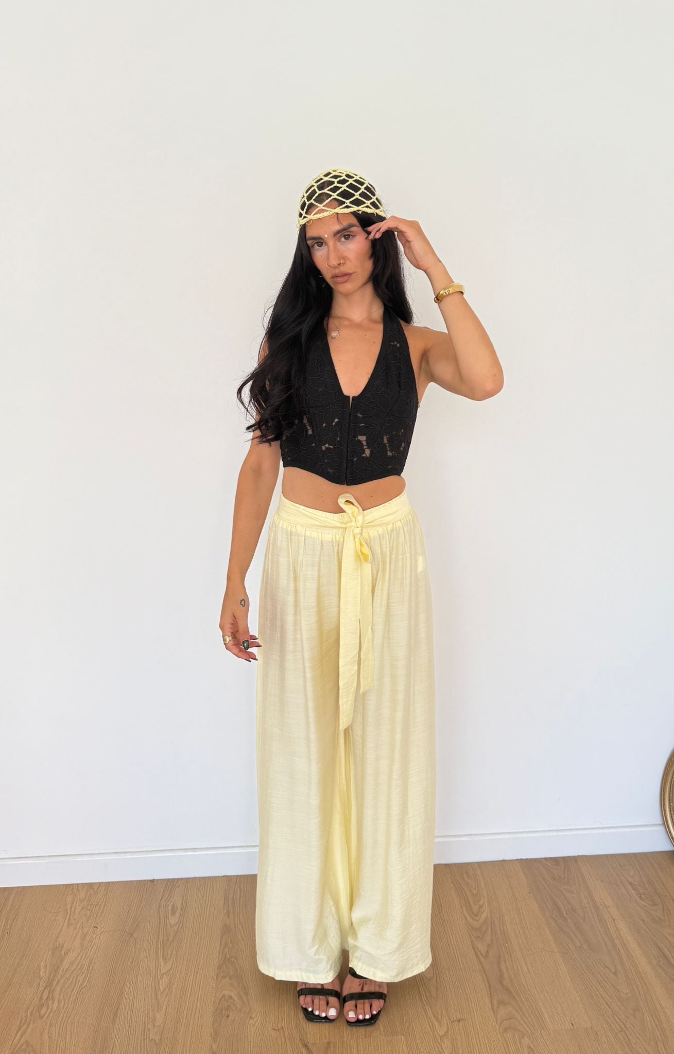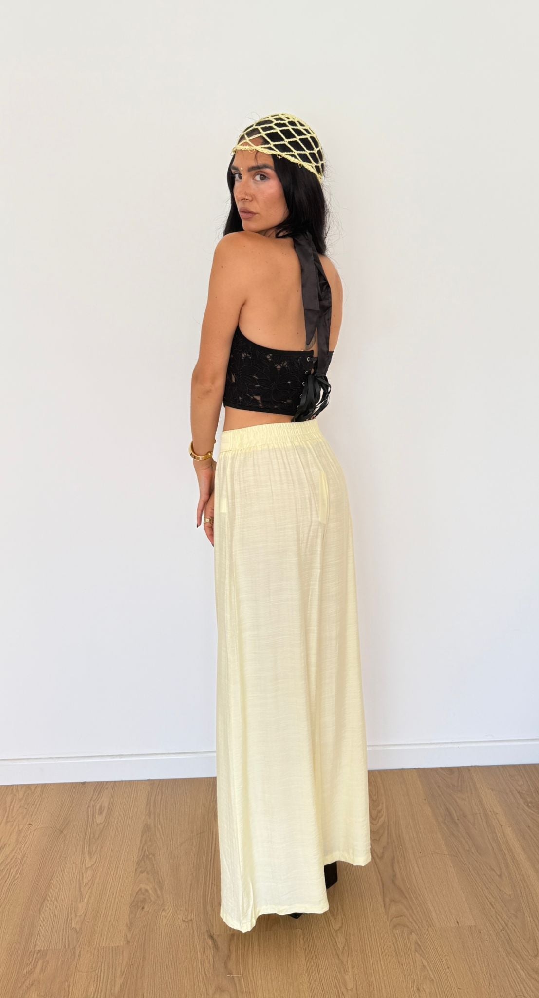 Pantalone da donna in lino gamba larga con laccio sul davanti ed elastico sul retro. La modella indossa taglia S/M.