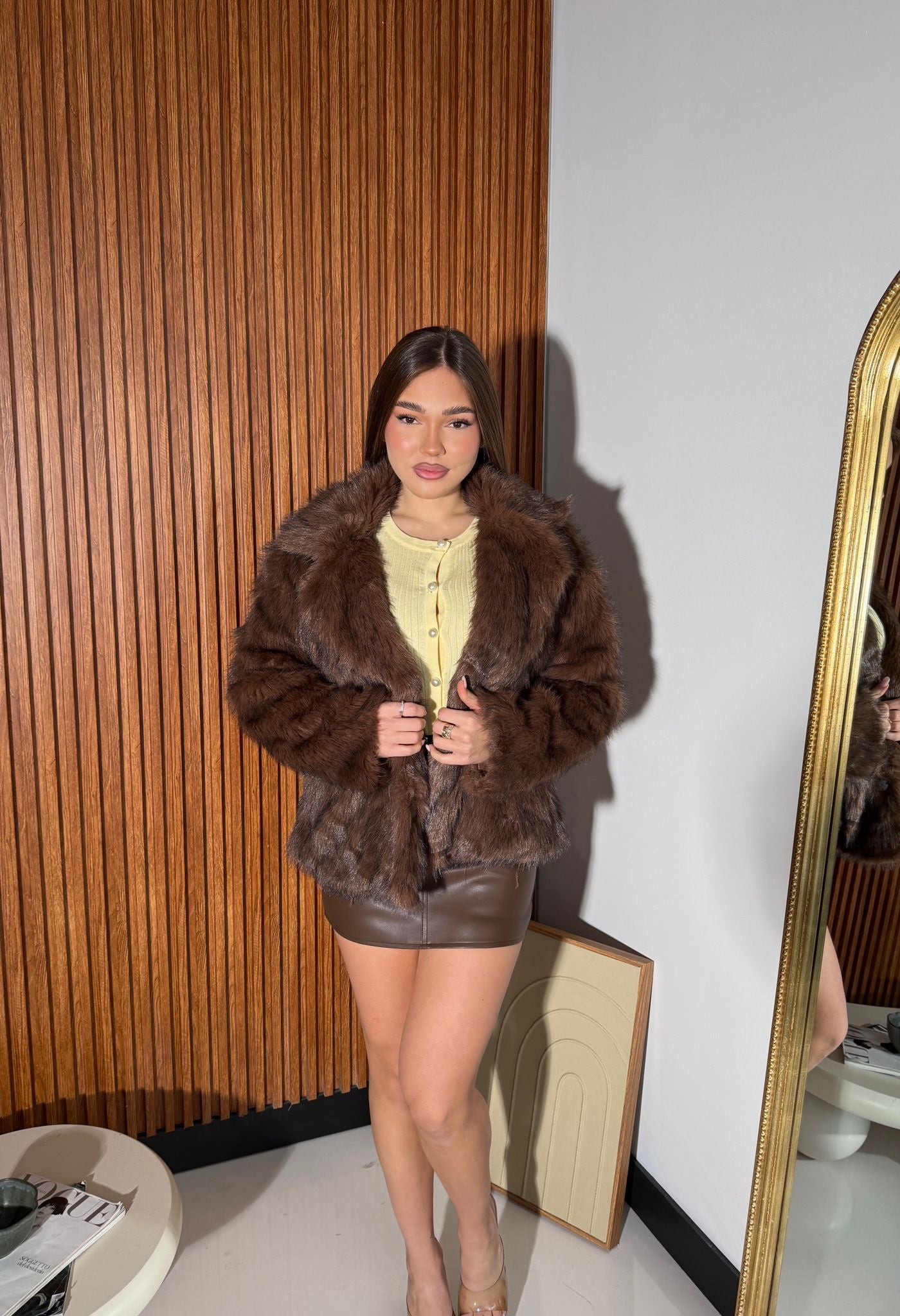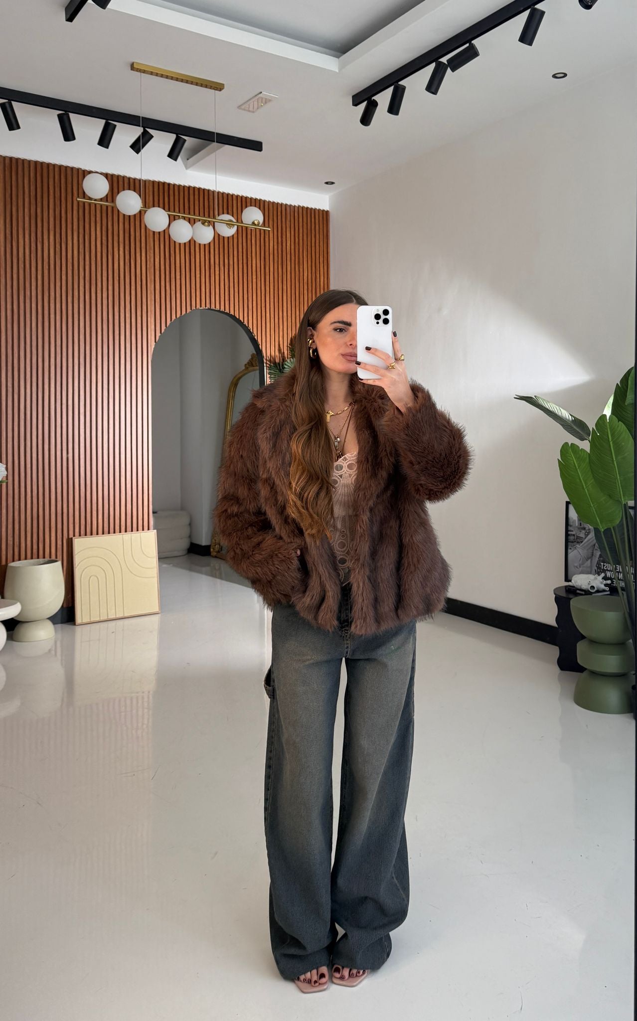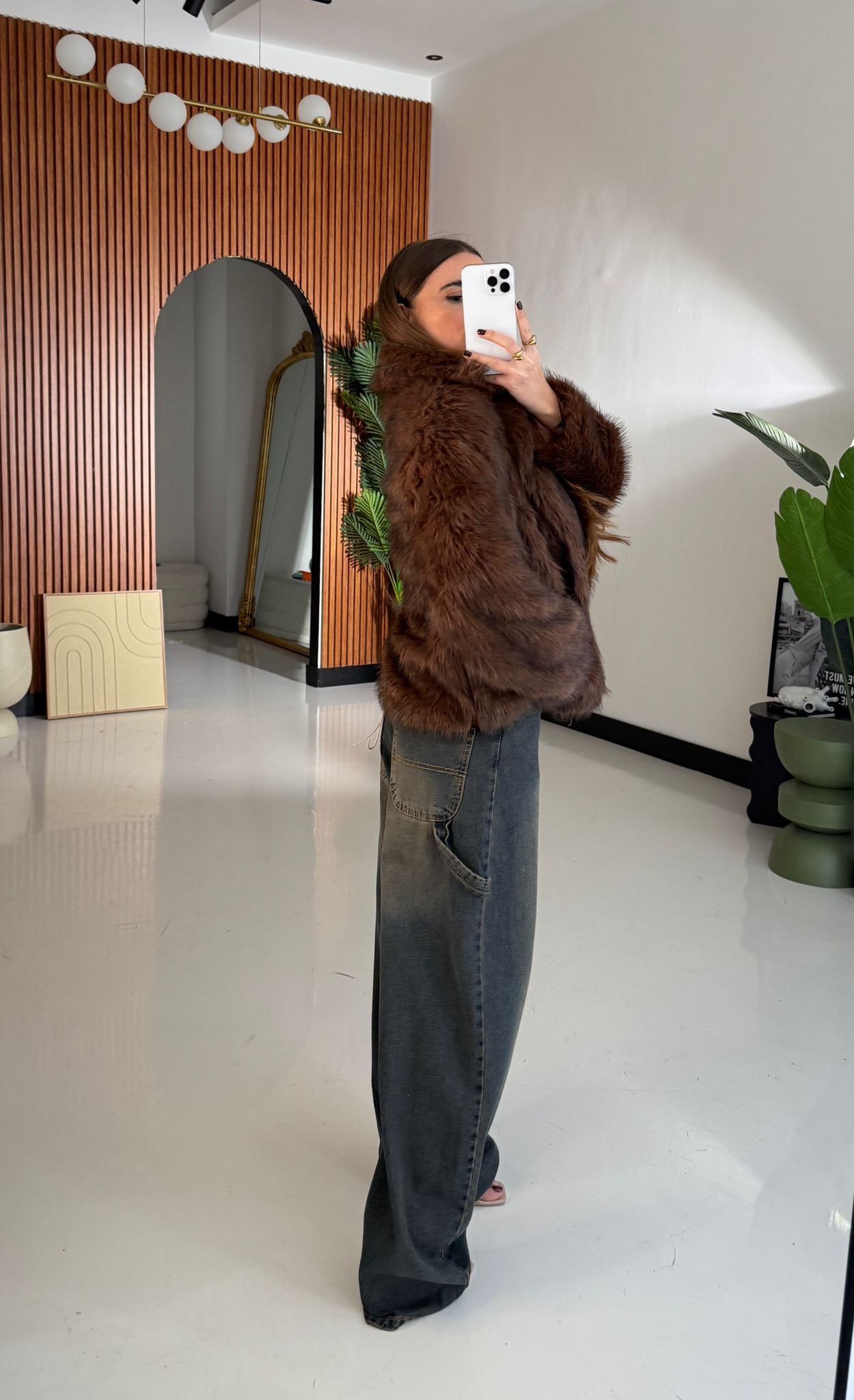 Pelliccia da donna foderata internamente, con chiusura a bottone. Taglia unica, veste bene fino ad una taglia M/L. La modella é alta 1,65 e pesa 52/53kg.