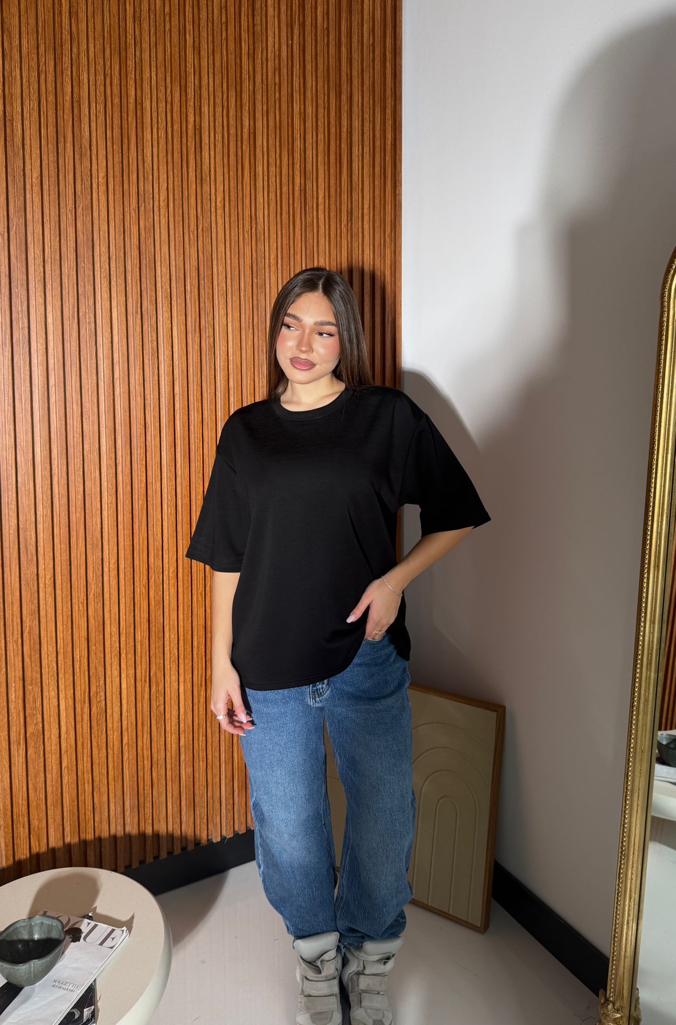 Shirt da donna in cotone doppio, modello oversize, tessuto semi elasticizzato. Taglia unica, veste bene fino ad una taglia L/XL. La modella è alta 1,65 e pesa 52/53kg.
