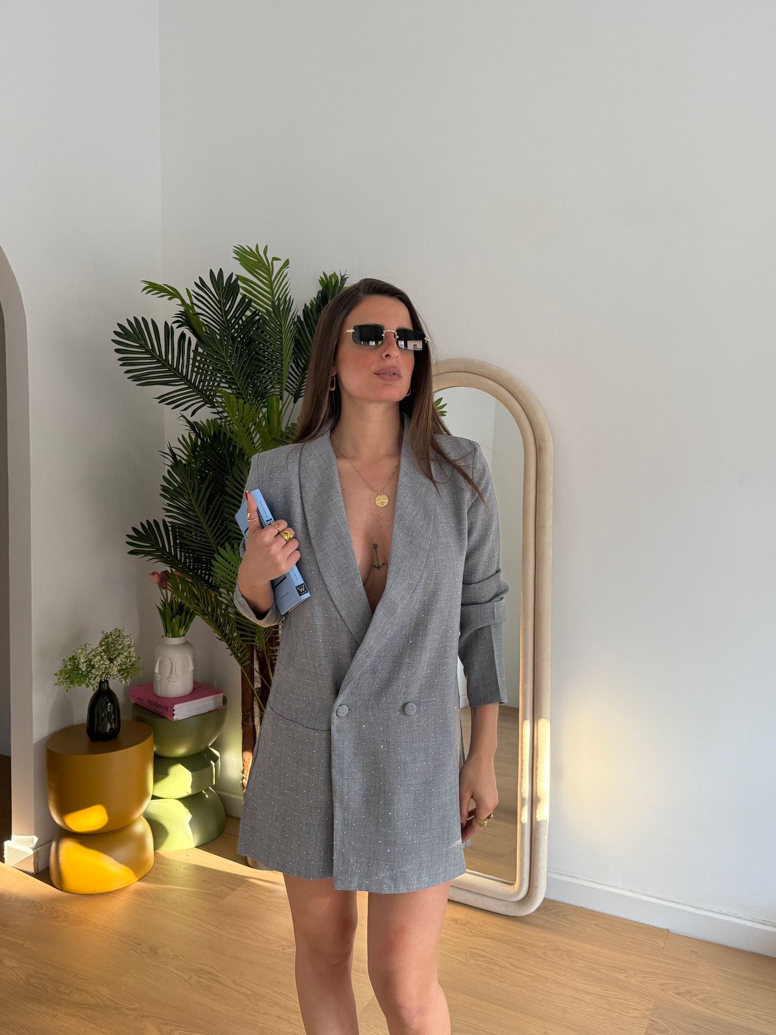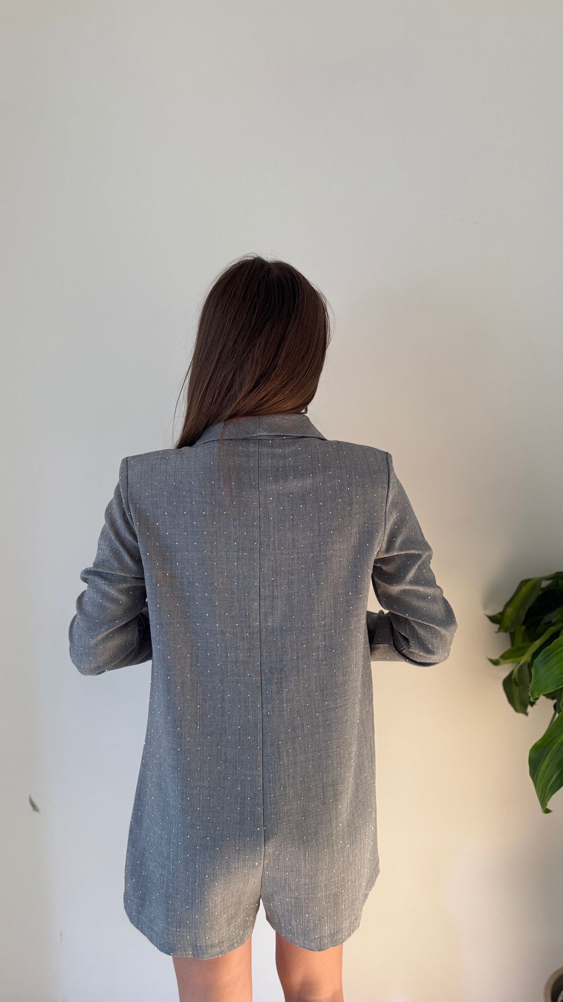 tutina da donna in conto e leggero ricoperto di strass sia sul davanti che sul retro, top quality veste regolarmente la propria taglia e Giusy indossa taglia S