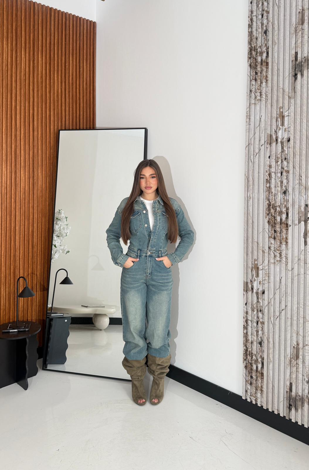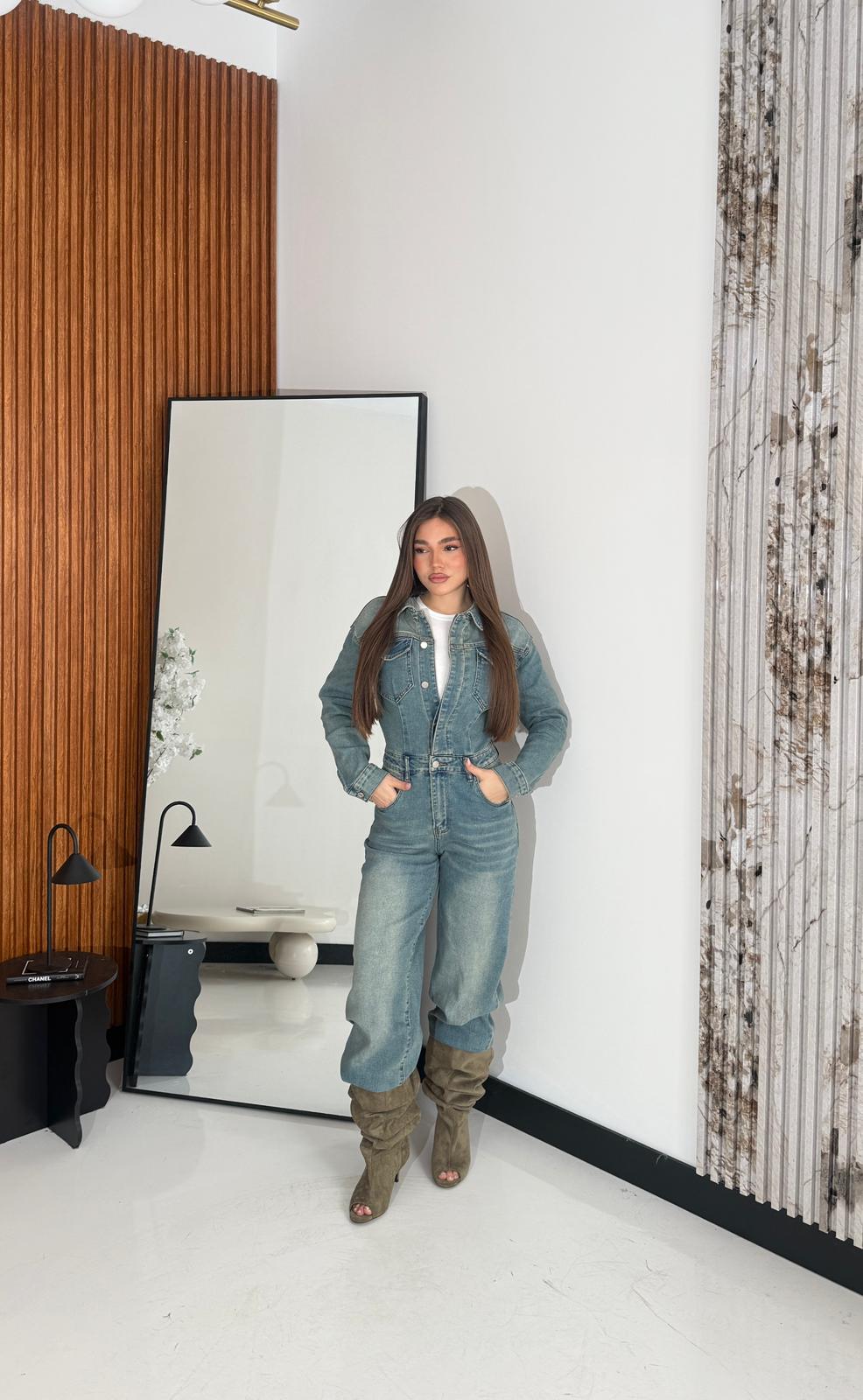 Tutone in denim in tela semi elasticizzata con chiusura con bottoni sul davanti e veste bene la propria taglia e la modella indossa taglia XS ed è alta 1,65 cm e pesa 52/58 kg
