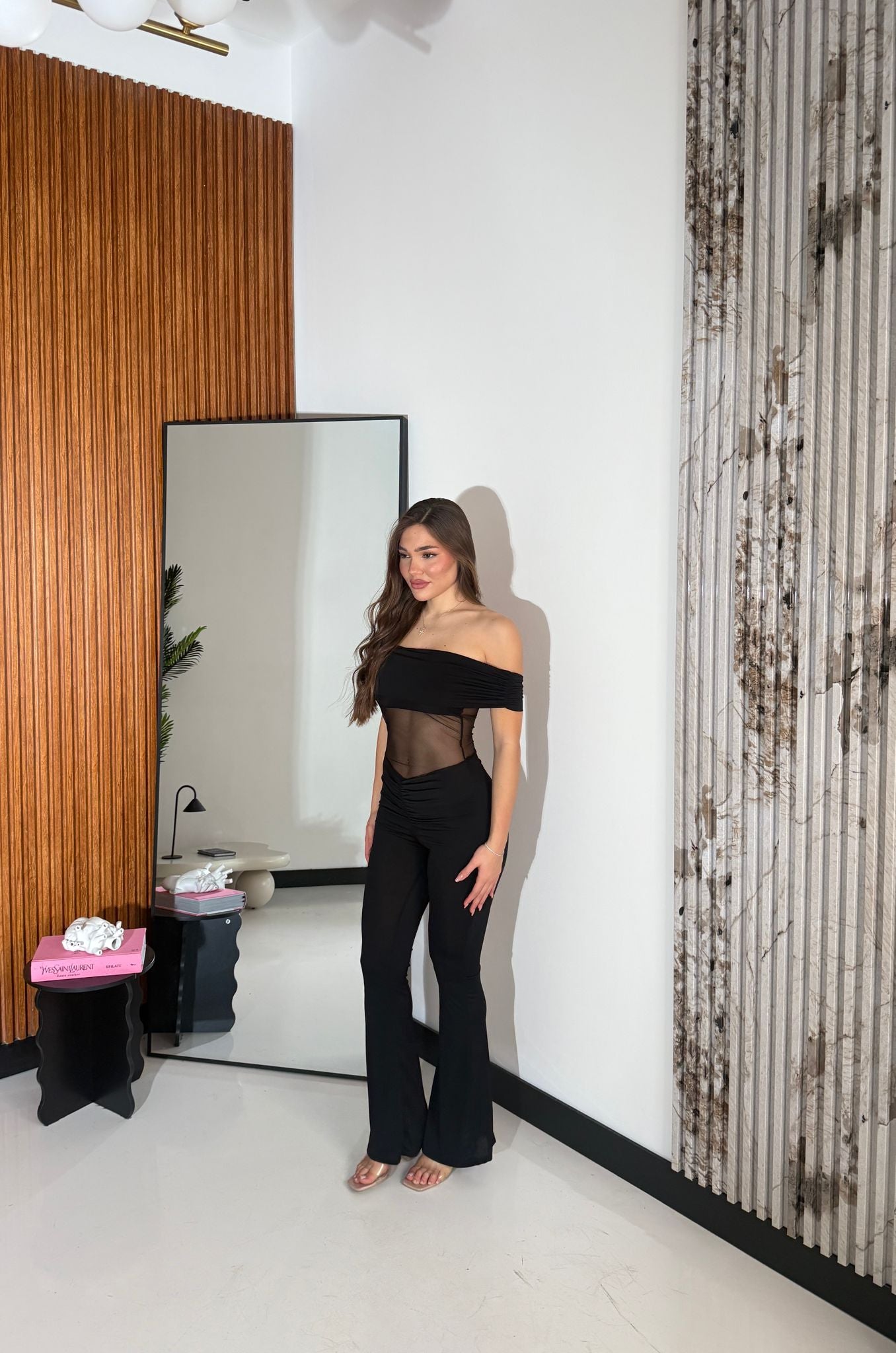Tutone in lycra con scollo a barca e finitura pantalone a zampetta, tessuto elasticizzato e vestita bene fino ad una M/L e la modella è alta 1,65 cm e pesa 52/53 kg