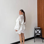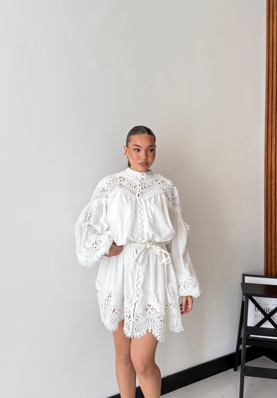 Vestitino in cotone con sottabito, chiusura a bottoncini rivestiti sul davanti, manica a sbuffo con elastico ai polsini, cintura compresa e dettagli in macramè. Taglia unica, veste bene fino ad una taglia L/XL. La modella è alta 1,65 cm e pesa 52/53 kg
